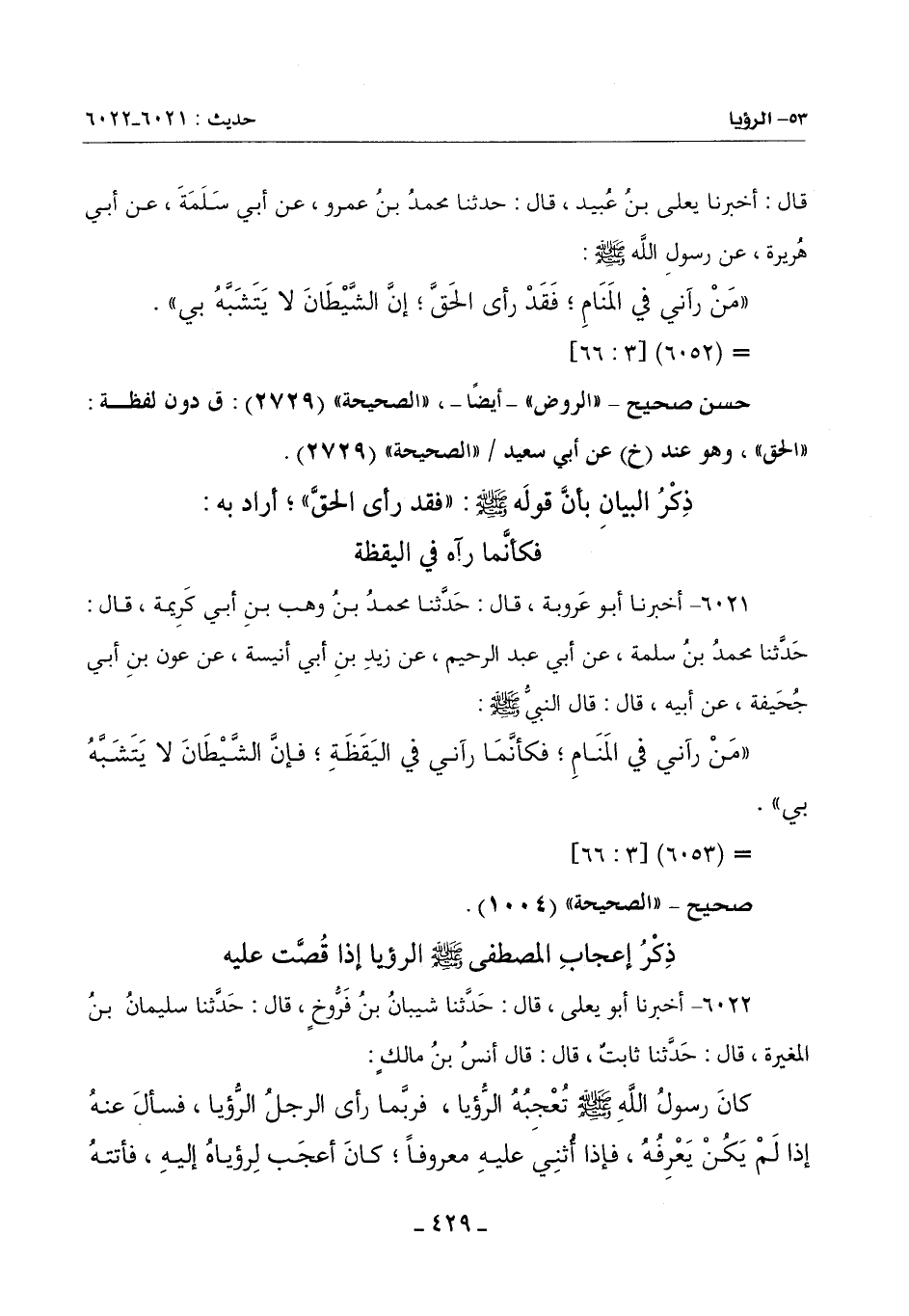 (مَنْ رَآنِي فِي الْمَنَامِ فَكَأَنَّمَا رَآنِي فِي الْيَقَظَةِ فَإِنَّ الشَّيْطَانَ لا يَتَشَبَّهُ بي)