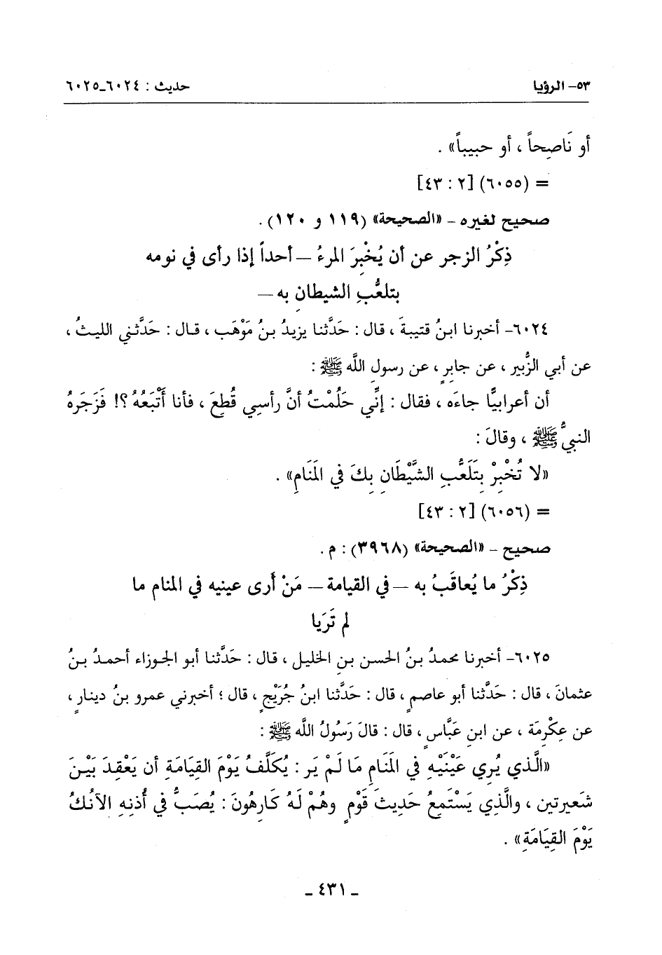 (الَّذِي يُرِي عَيْنَيْهِ فِي الْمَنَامِ مَا لَمْ يَرَ يُكَلَّفُ يَوْمَ الْقِيَامَةِ أَنْ يَعْقِدَ بَيْنَ شَعِيرَتَيْنِ وَالَّذِي يَسْتَمِعُ حَدِيثَ قَوْمٍ وَهُمْ لَهُ كَارِهُونَ يُصَبُّ في أُذنه الآنك يوم القيامة) -[432]-