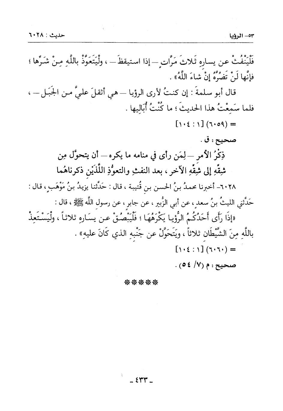 (إِذَا رَأَى أَحَدُكُمُ الرُّؤْيَا يَكْرَهُهَا فَلْيَبْصُقْ عَنْ يَسَارِهِ ثَلَاثًا ولْيَسْتَعِذْ بِاللَّهِ مِنَ الشَّيْطَانِ ثَلَاثًا ويتحوَّل عَنْ جَنْبِهِ الَّذِي كَانَ عَلَيْهِ)