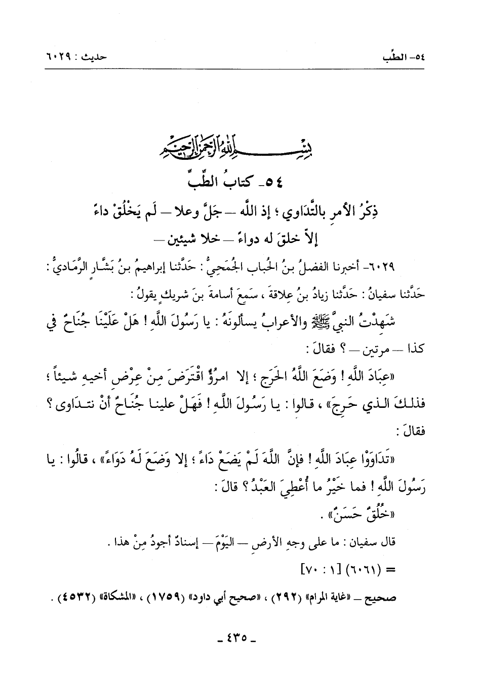 6029 - أَخْبَرَنَا الْفَضْلُ بْنُ الْحُبَابِ الْجُمَحِيُّ حَدَّثَنَا إِبْرَاهِيمُ بْنُ بَشَّارٍ الرَّمَادِيُّ حَدَّثَنَا سُفْيَانُ حَدَّثَنَا زِيَادُ بْنُ عِلَاقَةَ: سَمِعَ أُسَامَةَ بْنَ شَرِيكٍ يَقُولُ: