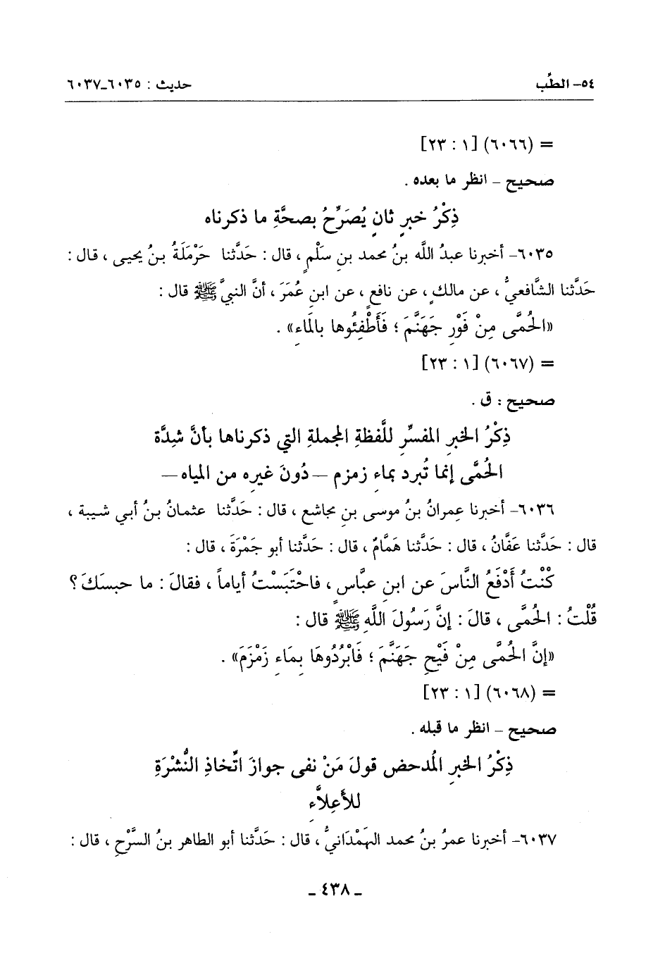 ذِكْرُ الْخَبَرِ الْمُفَسِّرِ لِلَّفْظَةِ الْمُجْمَلَةِ الَّتِي ذَكَرْنَاهَا بِأَنَّ شِدَّةَ الْحُمَّى إِنَّمَا تُبرد بِمَاءِ زَمْزَمَ دُونَ غَيْرِهِ مِنَ الْمِيَاهِ