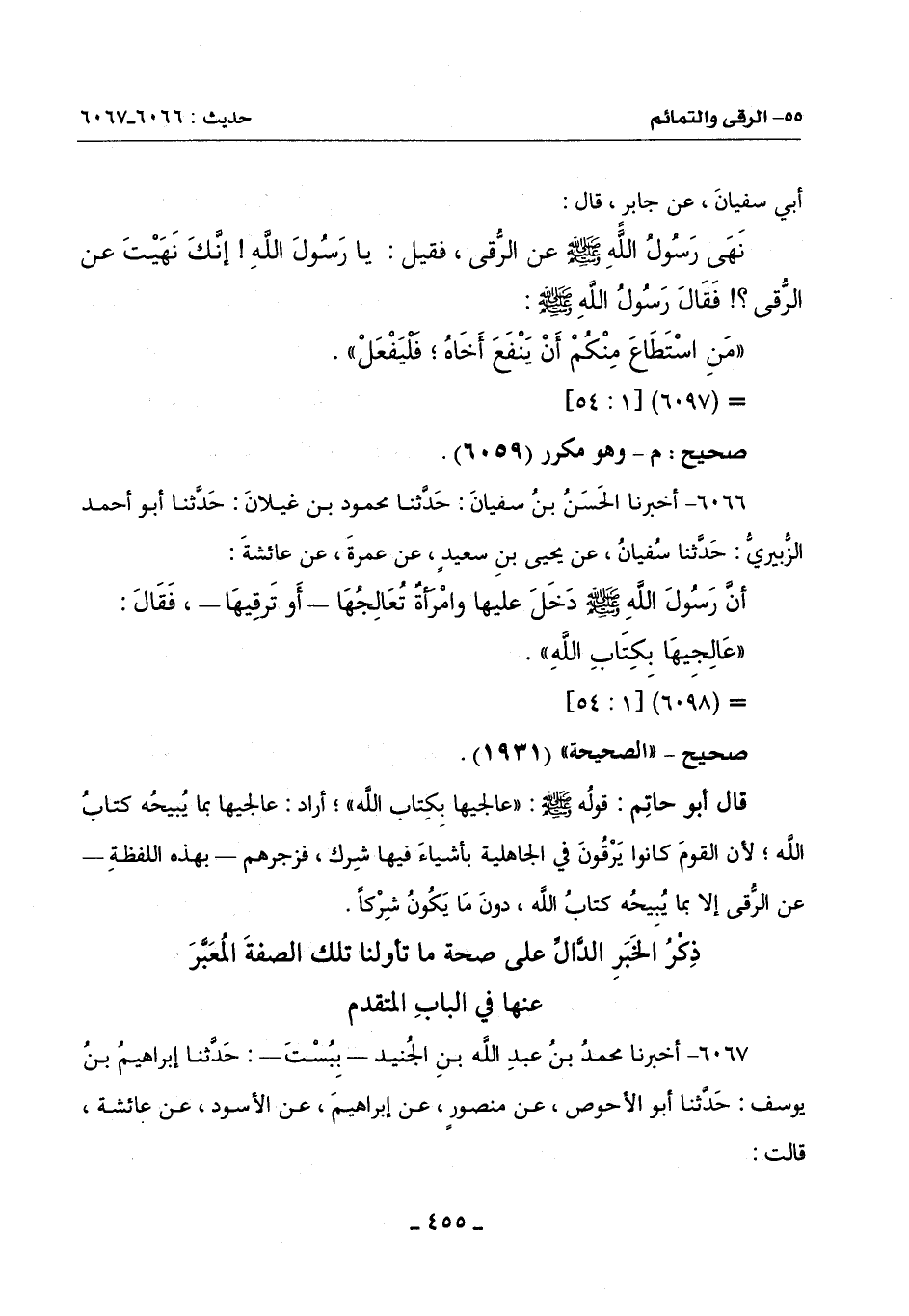 قَالَ أَبُو حَاتِمٍ: قَوْلُهُ صَلَّى اللَّهُ عَلَيْهِ وَسَلَّمَ: (عَالِجِيهَا بِكِتَابِ اللَّهِ) أَرَادَ: عَالِجِيهَا بِمَا يُبيحه كِتَابُ اللَّهِ لِأَنَّ الْقَوْمَ كَانُوا يَرْقُونَ فِي الْجَاهِلِيَّةِ بِأَشْيَاءَ فِيهَا شِرْكٌ فَزَجَرَهُمْ ـ بِهَذِهِ اللَّفْظَةِ ـ عَنِ الرُّقَى إِلَّا بِمَا يُبِيحُهُ كِتَابُ اللَّهِ دُونَ مَا يَكُونُ شِرْكًا