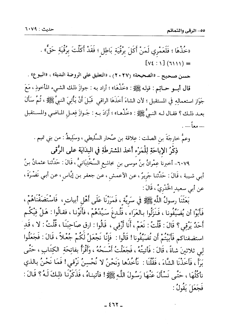 بَعَثَنَا رَسُولُ اللَّهِ صَلَّى اللَّهُ عَلَيْهِ وَسَلَّمَ فِي سَرَّيةٍ فَمَرَرْنَا عَلَى أَهْلِ أَبْيَاتٍ فَاسْتَضَفْنَاهُمْ فَأَبَوْا أَنْ يُضَيِّفُونا فَنَزَلُوا بِالْعَرَاءِ فَلُدِغَ سَيِّدُهُمْ فَأَتَوْنَا فَقَالُوا: هَلْ فِيكُمْ أَحَدٌ يَرْقِي؟ قَالَ: قُلْتُ: نَعَمْ أَنَا أَرْقِي قَالُوا: ارْقِ صَاحِبَنَا قُلْتُ: لَا , قَدِ اسْتَضَفْنَاكُمْ فَأَبَيْتُمْ أَنْ تُضَيِّفُونا قَالُوا: فَإِنَّا نَجْعَلُ لَكُمْ جُعْلًا قَالَ: فَجَعَلُوا لِي ثَلَاثِينَ شَاةً قَالَ: فَأَتَيْتُهُ فَجَعَلْتُ أَمْسَحُهُ وَأَقْرَأُ بِفَاتِحَةِ الْكِتَابِ حَتَّى بَرَأَ فأخذ الشَّاءَ فَقُلْنَا: نَأْخُذُهَا وَنَحْنُ لَا نُحْسِنُ نَرْقِي فَمَا نَحْنُ بِالَّذِي نَأْكُلُهَا حَتَّى نَسْأَلَ عَنْهَا رَسُولَ اللَّهِ صَلَّى اللَّهُ عَلَيْهِ وَسَلَّمَ فَأَتَيْنَاهُ فَذَكَرْنَا ذَلِكَ لَهُ قَالَ: فَجَعَلَ يَقُولُ: -[463]-
