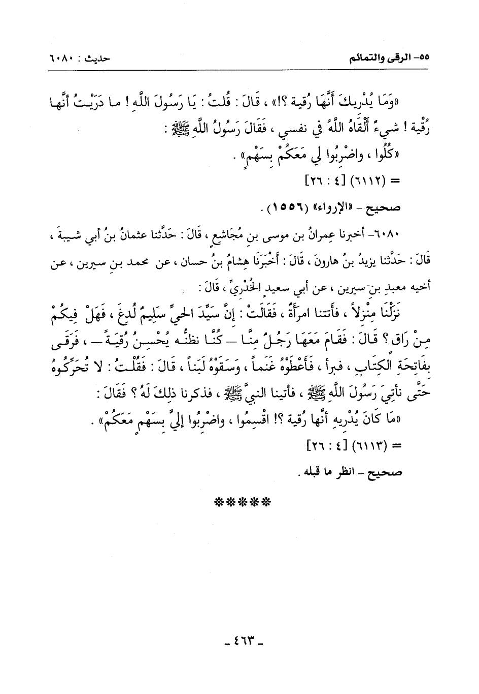 نَزَلْنَا مِنْزِلاً فَأَتَتْنَا امْرَأَةٌ فَقَالَتْ: إِنَّ سَيِّدَ الْحَيِّ سَلِيمٌ لُدِغَ فَهَلْ فِيكُمْ مِنْ رَاقٍ؟ قَالَ: فَقَامَ مَعَهَا رَجُلٌ مِنَّا ـ كُنَّا نظنُّه يُحْسِنُ رُقيَةً ـ فَرَقَى بِفَاتِحَةِ الْكِتَابِ فَبَرَأَ فَأَعْطَوْهُ غَنَمًا وسَقَوْهُ لَبَنًا قَالَ: فَقُلْتُ: لَا تُحَرِّكُوه حَتَّى نَأْتِيَ رَسُولَ اللَّهِ صَلَّى اللَّهُ عَلَيْهِ وَسَلَّمَ فَأَتَيْنَا النَّبِيَّ صَلَّى اللَّهُ عَلَيْهِ وَسَلَّمَ فَذَكَرْنَا ذَلِكَ لَهُ فَقَالَ: