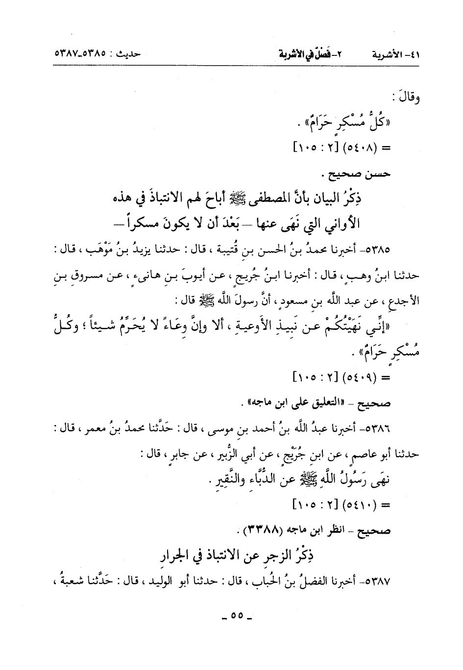 5385 - أَخْبَرَنَا مُحَمَّدُ بْنُ الْحَسَنِ بْنِ قُتَيْبَةَ، قَالَ: حَدَّثَنَا يَزِيدُ بْنُ مَوْهَبٍ، قَالَ: حَدَّثَنَا ابْنُ وَهْبٍ، قَالَ: أَخْبَرَنَا ابْنُ جُرَيْجٍ، عَنْ أَيُّوبَ بن هانىء، عَنْ مَسْرُوقِ بْنِ الْأَجْدَعِ، عَنْ عَبْدِ اللَّهِ بْنِ مَسْعُودٍ، أَنَّ رَسُولَ اللَّهِ صَلَّى اللَّهُ عَلَيْهِ وَسَلَّمَ قَالَ: