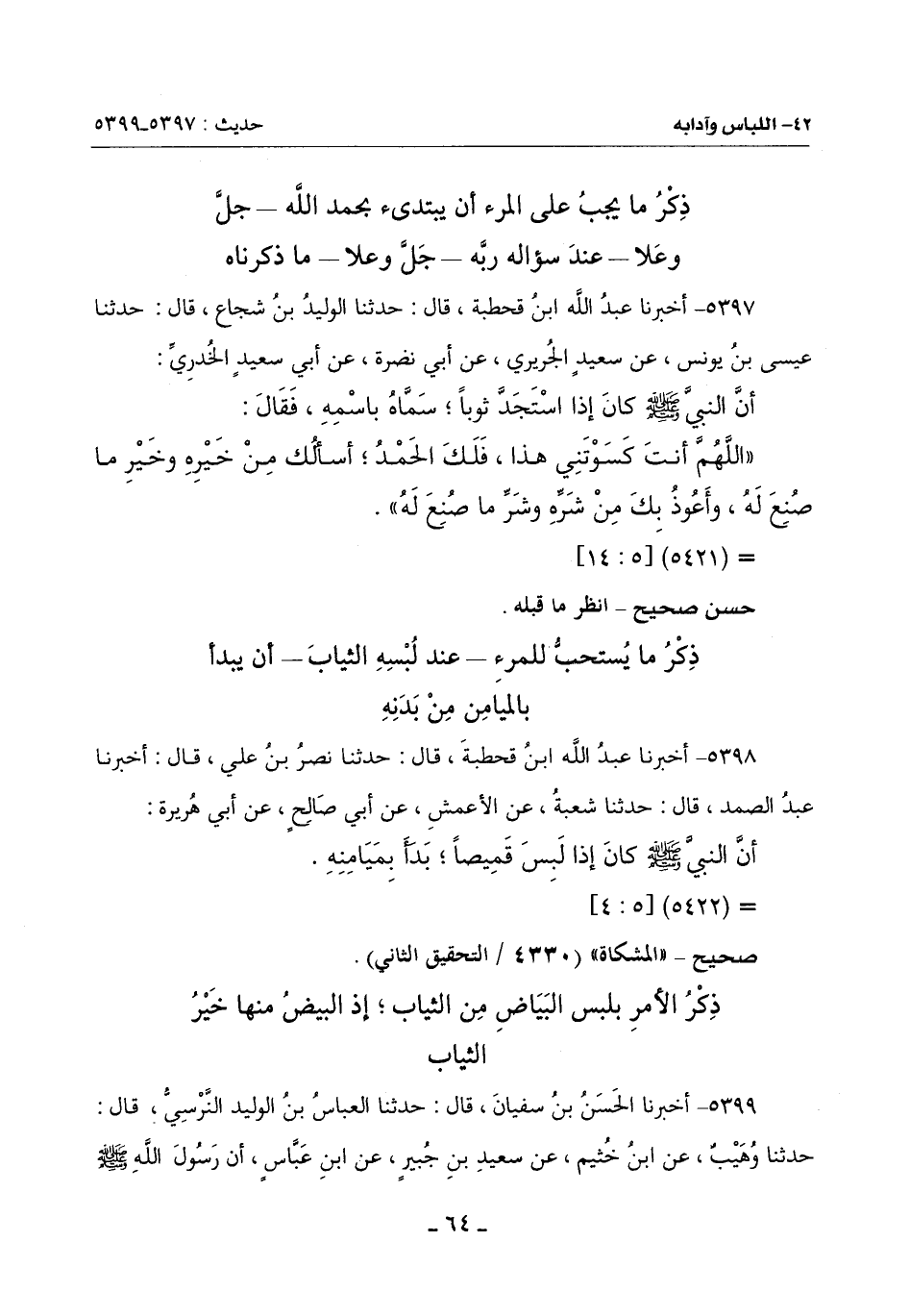 5397 - أَخْبَرَنَا عَبْدُ اللَّهِ بْنُ قَحْطَبَةَ، قَالَ: حَدَّثَنَا الْوَلِيدُ بْنُ شُجَاعٍ، قَالَ: حَدَّثَنَا عِيسَى بْنُ يُونُسَ، عَنْ سَعِيدٍ الْجُرَيْرِيِّ، عَنْ أَبِي نَضْرَةَ، عَنْ أَبِي سَعِيدٍ الْخُدْرِيِّ: