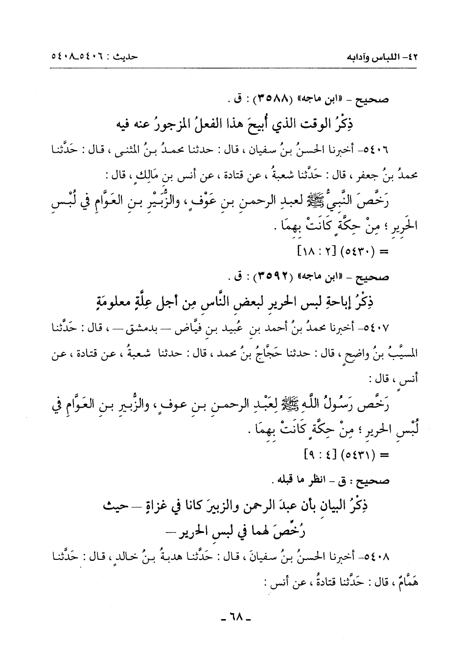 رخَّص النَّبِيُّ صَلَّى اللَّهُ عَلَيْهِ وَسَلَّمَ لِعَبْدِ الرَّحْمَنِ بْنِ عَوْفٍ، وَالزُّبَيْرِ بْنِ الْعَوَّامِ فِي لُبْسِ الْحَرِيرِ؛ مِنْ حِكَّةٍ كانت بهما.