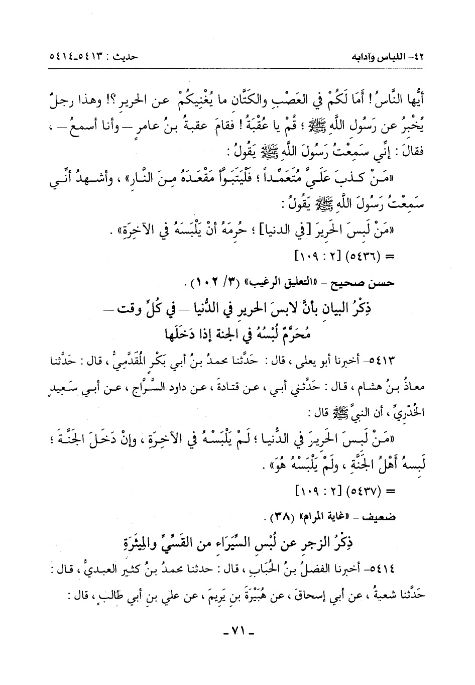 5414 - أَخْبَرَنَا الْفَضْلُ بْنُ الْحُبَابِ، قَالَ: حَدَّثَنَا مُحَمَّدُ بْنُ كَثِيرٍ الْعَبْدِيُّ، قَالَ: حَدَّثَنَا شُعْبَةُ، عَنْ أَبِي إِسْحَاقَ، عَنِ هُبَيْرَةَ بْنِ يَرِيمَ، عَنْ عَلِيَّ بْنَ أَبِي طَالِبٍ، قَالَ: -[72]-