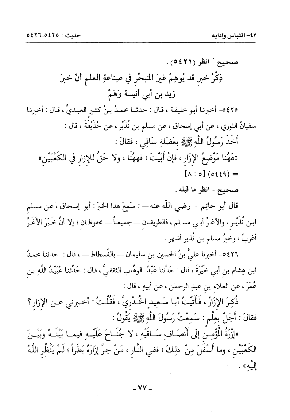 ((إِزْرَةُ الْمُؤْمِنِ إِلَى أَنْصَافِ سَاقَيْهِ , لَا جُنَاحَ عَلَيْهِ فِيمَا بَيْنَهُ وَبَيْنَ الْكَعْبَيْنِ , وَمَا أَسْفَلَ مِنْ ذَلِكَ؛ فَفِي النَّارِ مَنْ جرَّ إِزَارَهُ بَطَرًا؛ لم ينظر الله إليه)). -[78]-