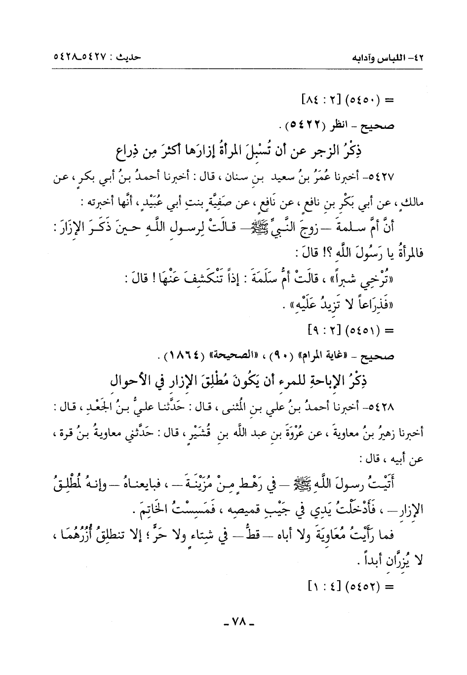 5427 - أَخْبَرَنَا عُمَرُ بْنُ سَعِيدِ بْنِ سِنَانٍ , قَالَ: أَخْبَرَنَا أَحْمَدُ بْنُ أَبِي بَكْرٍ , عَنْ مَالِكٍ , عَنْ أَبِي بَكْرِ بْنِ نَافِعٍ , عَنْ نَافِعٍ , عَنْ صَفِيَّةَ بِنْتِ أَبِي عُبَيْدٍ , أَنَّهَا أَخْبَرَتْهُ: