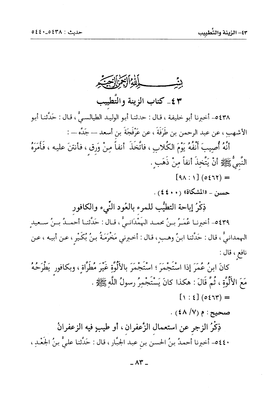 5438 - أَخْبَرَنَا أَبُو خَلِيفَةَ، قَالَ: حَدَّثَنَا أَبُو الْوَلِيدِ الطَّيَالِسِيُّ، قَالَ: حَدَّثَنَا أَبُو الْأَشْهَبِ، عَنْ عَبْدِ الرَّحْمَنِ بْنِ طَرَفَةَ، عَنْ عَرْفَجَةَ بْنِ أَسْعَدَ - جَدِّهِ -: