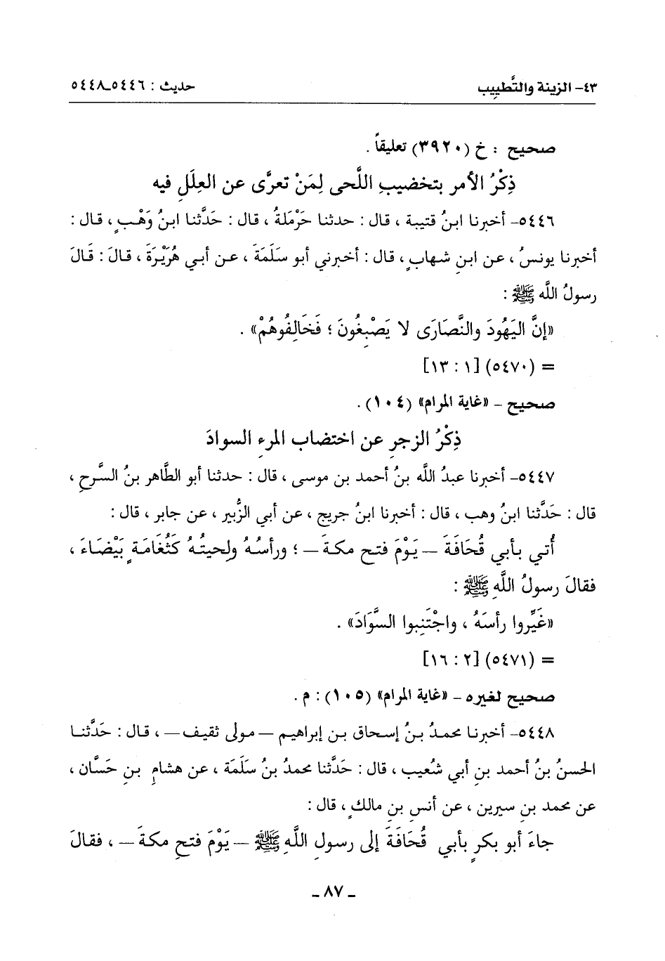 ذِكْرُ الْأَمْرِ بِتَخْضِيبِ اللِّحَى لِمَنْ تعرَّى عَنِ العلل فيه