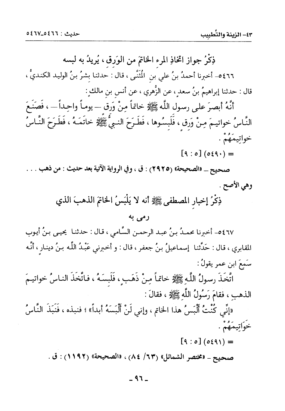 ((إِنِّي كُنْتُ أَلْبَسُ هَذَا الْخَاتَمَ، وَإِنِّي لَنْ أَلْبَسَهُ أَبَدًا))؛ فَنَبَذَهُ، فَنَبَذَ النَّاسُ خواتيمهم.