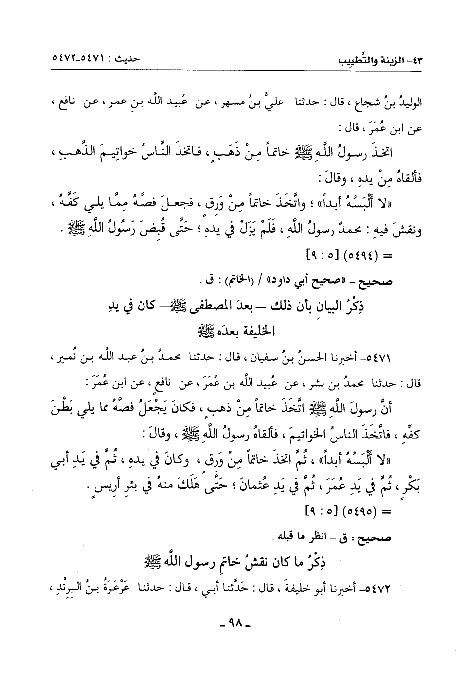 5471 - أَخْبَرَنَا الْحَسَنُ بْنُ سُفْيَانَ، قَالَ: حَدَّثَنَا مُحَمَّدُ بْنُ عَبْدِ اللَّهِ بْنِ نُمَيْرٍ، قَالَ: حَدَّثَنَا مُحَمَّدُ بْنُ بِشْرٍ، عَنْ عُبَيْدِ اللَّهِ بْنِ عُمَرَ، عَنْ نَافِعٍ، عَنِ ابْنِ عُمَرَ: