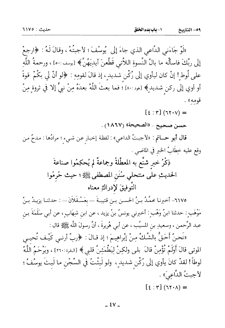 (نَحْنُ أَحَقُّ بالشَّكِّ مِنْ إِبْرَاهِيمَ إِذْ قَالَ: {رَبِّ أَرِنِي كَيْفَ تُحيي الْمَوْتَى قَالَ: أَوَلَمْ تُؤْمِنْ قَالَ: بَلَى وَلَكِنْ لِيَطْمَئِنَّ قَلْبِي} [البقرة: 260] وَيَرْحَمُ اللَّهُ لُوطًا لَقَدْ كَانَ يَأْوِي إِلَى رُكن شَدِيدٍ وَلَوْ لَبِثْتُ فِي السِّجْنِ مَا لَبِثَ يوسف لأجبتُ الداعي)