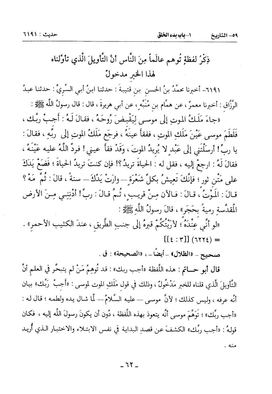 قَالَ أَبُو حَاتِمٍ: هَذِهِ اللَّفْظَةُ (أَجِبْ رَبَّكَ) قَدْ تُوهِمُ مَنْ لَمْ يَتَبَحَّرْ فِي الْعِلْمِ أَنَّ التَّأْوِيلَ الَّذِي قُلْنَاهُ لِلْخَبَرِ مَدْخُولٌ وَذَلِكَ فِي قَوْلِ مَلَكِ الْمَوْتِ لِمُوسَى: (أَجِبْ رَبَّكَ) بَيَانٌ أَنَّهُ عَرَفَهُ وَلَيْسَ كَذَلِكَ لِأَنَّ مُوسَى عَلَيْهِ السَّلَامُ لَمَّا شَالَ يَدَهُ وَلَطَمَهُ قَالَ لَهُ: (أَجِبْ رَبَّكَ) تَوَهَّمَ مُوسَى أَنَّهُ يَتَعَوَّذُ بِهَذِهِ اللَّفْظَةِ دُونَ أَنْ يَكُونَ رَسُولَ اللَّهِ إِلَيْهِ فَكَانَ قَوْلُهُ: (أَجِبْ رَبَّكَ) الْكَشْفَ عَنْ قَصْدِ الْبِدَايَةِ فِي نَفْسِ الِابْتِلَاءِ وَالِاخْتِبَارِ الَّذِي أريد منه