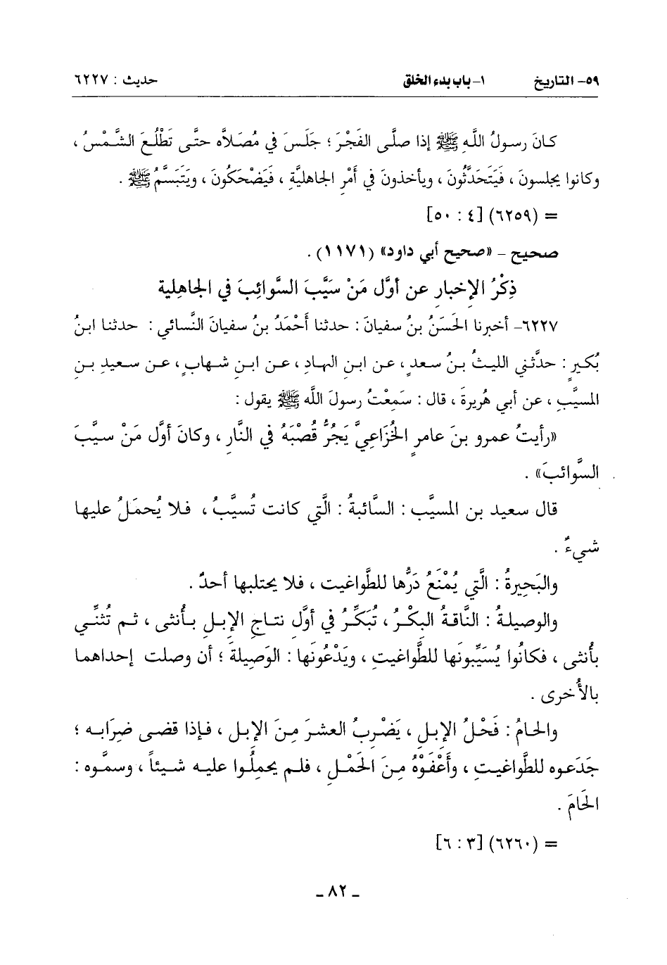 (رَأَيْتُ عَمْرَو بْنَ عَامِرٍ الْخُزَاعِيَّ يَجُرُّ قُصْبَهُ فِي النَّارِ وَكَانَ أَوَّلُ مَنْ سيَّب السَّوَائِبَ)