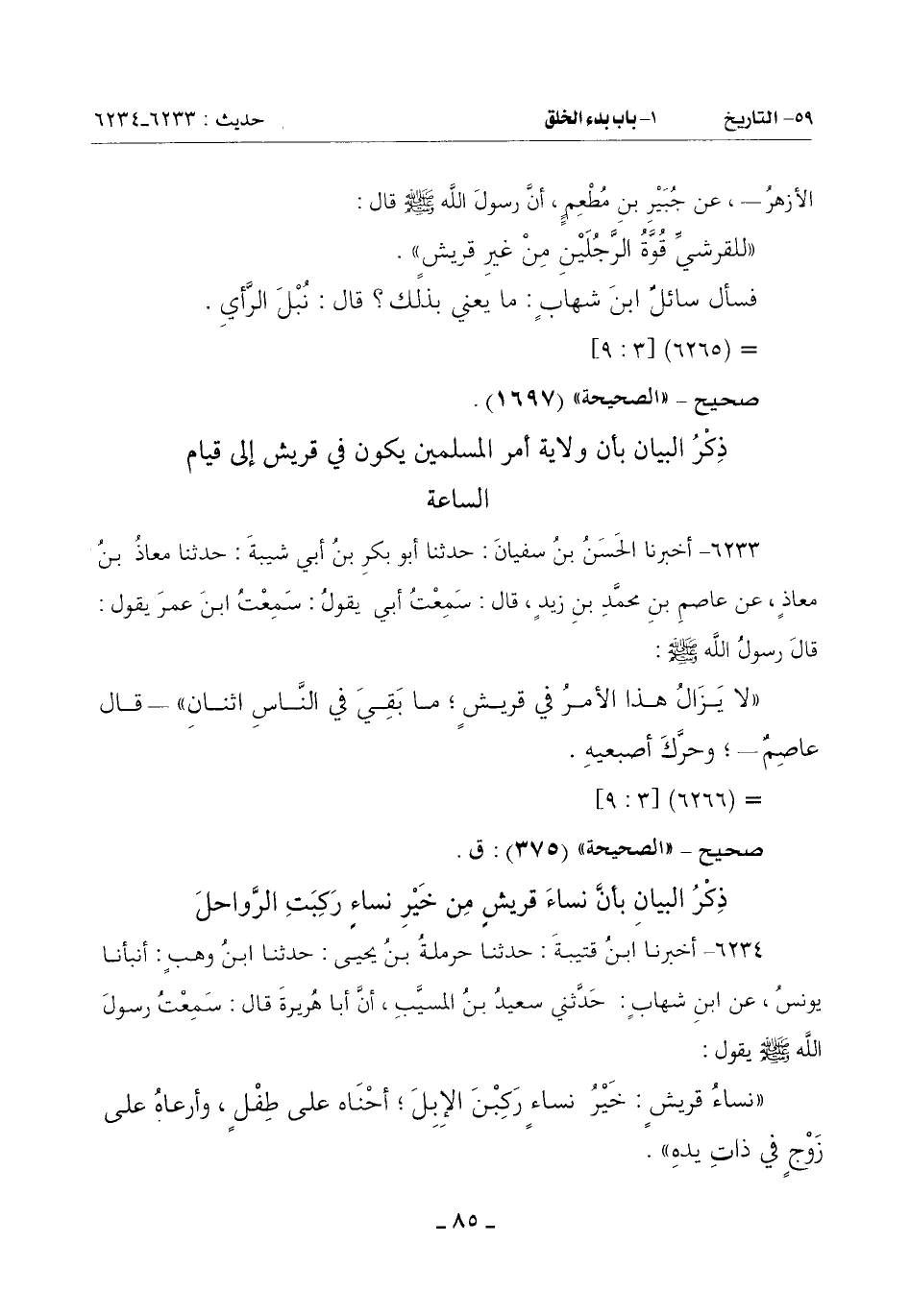 (نِسَاءُ قُرَيْشٍ خَيْرُ نِسَاءٍ رَكِبْنَ الْإِبِلَ أحْنَاه عَلَى طِفْلٍ وَأَرْعَاهُ عَلَى زَوْجٍ فِي ذَاتِ يَدِهِ) -[86]-