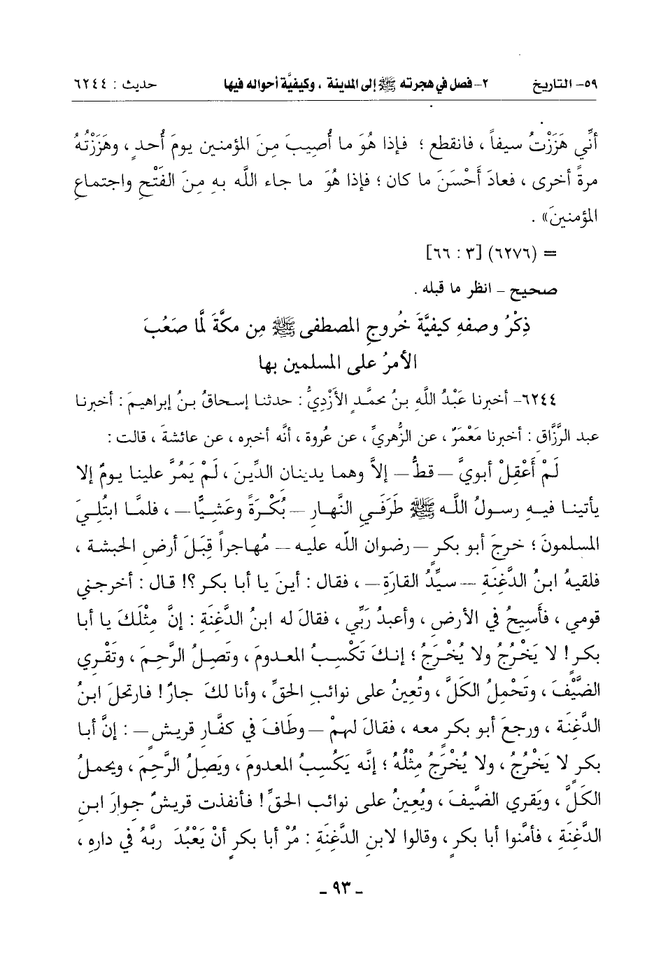 (أُرِيتُ دَارَ هِجْرَتِكُم أُرِيتُ سَبَخَةً ذَاتَ نَخْلٍ بين لاَبَيَتْنِ ـ وَهُمَا حَرَّتان ـ) فَهَاجَرَ مَنْ هَاجَرَ قِبَلَ الْمَدِينَةِ حِينَ ذَكَرَ رَسُولُ اللَّهِ صَلَّى اللَّهُ عَلَيْهِ وَسَلَّمَ ذَلِكَ وَرَجَعَ إِلَى الْمَدِينَةِ بَعْضُ مَنْ كَانَ هَاجَرَ إِلَى أَرْضِ الْحَبَشَةِ مِنَ الْمُسْلِمِينَ وتجهَّز أَبُو بَكْرٍ مُهَاجِرًا فَقَالَ رَسُولُ اللَّهِ صَلَّى اللَّهُ عَلَيْهِ وَسَلَّمَ: