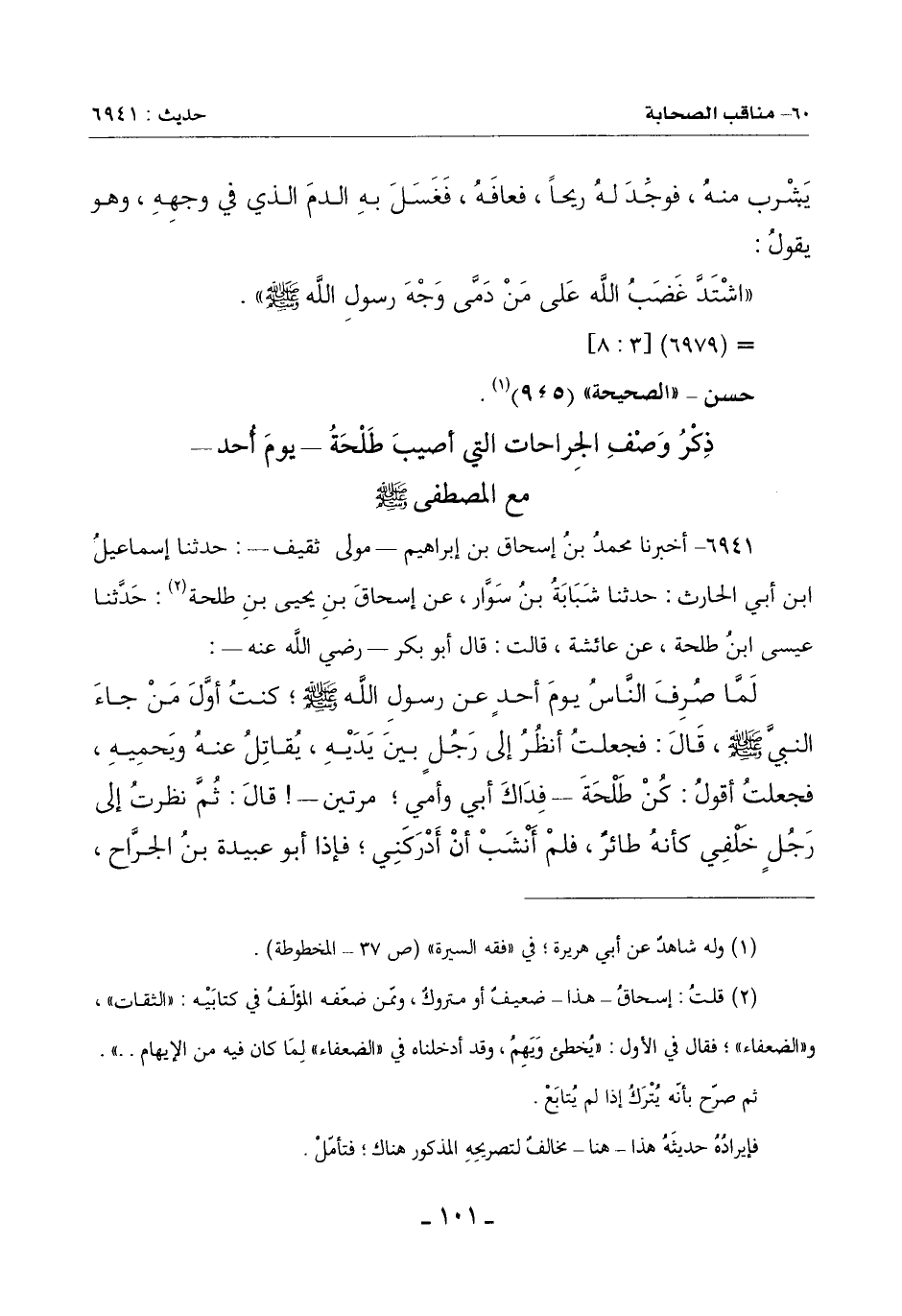 ذِكْرُ وَصْفِ الْجِرَاحَاتِ الَّتِي أُصِيبَ طَلْحَةُ يَوْمَ أُحُدٍ مَعَ الْمُصْطَفَى صَلَّى اللَّهُ عَلَيْهِ وَسَلَّمَ