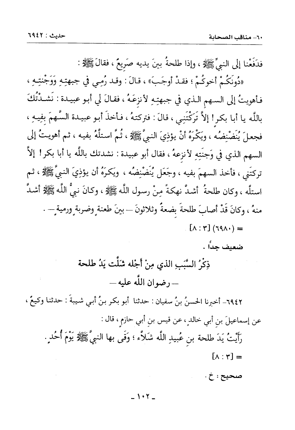 ذِكْرُ السَّبَبِ الَّذِي مِنْ أَجْلِهِ شَلَّت يَدُ طَلْحَةَ رِضْوَانُ اللَّهِ عَلَيْهِ
