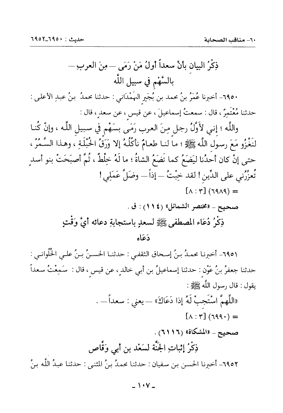 6950 - أَخْبَرَنَا عُمَرُ بْنُ مُحَمَّدِ بْنِ بُجَيْرٍ الْهَمْدَانِيُّ حَدَّثَنَا مُحَمَّدُ بْنُ عَبْدِ الْأَعْلَى حَدَّثَنَا مُعْتَمِرٌ قَالَ: سَمِعْتُ إِسْمَاعِيلَ عَنْ قَيْسٍ: عَنْ سَعْدٍ قَالَ: