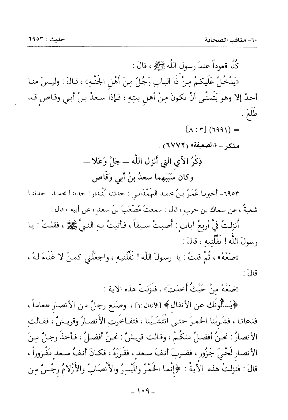 {يَسْأَلُونَكَ عَنِ الْأَنْفَالِ} [الأنفال: 1] وَصَنَعَ رَجُلٌ مِنَ الْأَنْصَارِ طَعَامًا فَدَعَانَا فَشَرِبْنَا الْخَمْرَ حَتَّى انْتَشَيْنَا فتفاخَرتِ الْأَنْصَارُ وَقُرَيْشٌ فَقَالَتِ الْأَنْصَارُ: نَحْنُ أَفْضَلُ مِنْكُمْ وَقَالَتْ قُرَيْشٌ: نَحْنُ أَفْضَلُ فَأَخَذَ رَجُلٌ مِنَ الْأَنْصَارِ لَحْيَ جَزُورٍ فَضَرَبَ أَنْفَ سَعْدٍ ففَزَرَهُ فَكَانَ أَنْفُ سَعْدٍ مَفْزوراً قَالَ: فَنَزَلَتْ هَذِهِ الْآيَةُ: {إِنَّمَا الْخَمْرُ وَالْمَيْسِرُ وَالْأَنْصَابُ وَالْأَزْلَامُ رِجْسٌ مِنْ -[110]- عَمَلِ الشَّيْطَانِ فَاجْتَنِبُوهُ لَعَلَّكُمْ تُفْلِحُونَ} [المائدة: 9] وَقَالَتْ أُمُّ سَعْدٍ: أَلَيْسَ قَدْ أَمَرَ اللَّهُ بِالْبِرِّ وَاللَّهِ لَا أَطْعَمُ طَعَامًا وَلَا أَشْرَبُ شَرَابًا حَتَّى أَمُوتَ أَوْ تَكفُرَ قَالَ: فَكَانُوا إِذَا أَرَادُوا أَنْ يُطعموها شَجَرُوا فَاهَا فَنَزَلَتْ هَذِهِ الْآيَةُ: {وَوَصَّيْنَا الْإِنْسَانَ بِوَالِدَيْهِ حُسْناً ... } الآية [العنكبوت: 8] قَالَ: وَدَخَلَ عَلَيَّ رَسُولُ اللَّهِ صَلَّى اللَّهُ عَلَيْهِ وسلم وأنا مريض يعودني قلت: يارسول اللَّهِ أُوصي بِمَالِي كُلِّهِ؟ قَالَ: