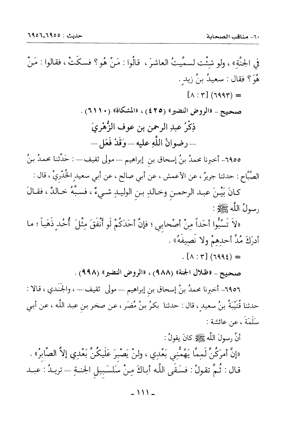 (إنَّ أمرَكُنَّ لَمِمَّا يهُمُّني بَعْدِي وَلَنْ يَصْبِرَ عليكُنَّ بَعْدِي إِلَّا الصَّابِرُ) قَالَ: ثُمَّ تَقُولُ: فَسَقَى اللَّهُ أَبَاكَ مِنْ سَلْسَبِيلِ الْجَنَّةِ - تُرِيدُ عَبْدَ -[112]- الرَّحْمَنِ بْنَ عَوْفٍ وَكَانَ قَدْ وَصَلَ أَزْوَاجَ النَّبِيِّ صَلَّى اللَّهُ عليه وسلم بمال بِيعَ بأربعين ألفاً.