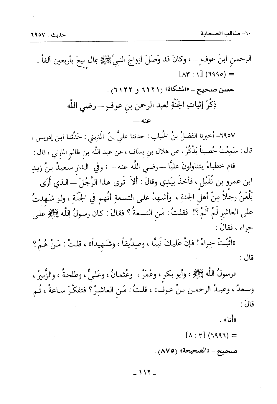 رَسُولُ اللَّهِ صَلَّى اللَّهُ عَلَيْهِ وَسَلَّمَ وَأَبُو بَكْرٍ وَعُمَرُ وَعُثْمَانُ وَعَلِيٌّ وَطَلْحَةُ وَالزُّبَيْرُ وَسَعْدٌ وَعَبْدُ الرَّحْمَنِ بْنُ عَوْفٍ قُلْتُ: مَنِ الْعَاشِرُ؟ فتفكَّرَ سَاعَةً ثُمَّ قَالَ: