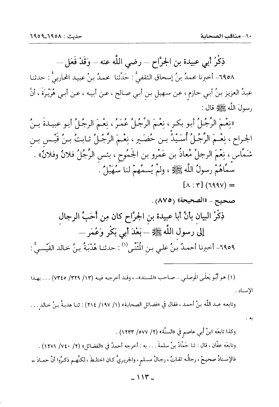 وتابعه عبد الله بن أحمد فقال في ((فضائل الصحابة)) (1/ 197/214): ثنا هدبة بن خالد .... به.