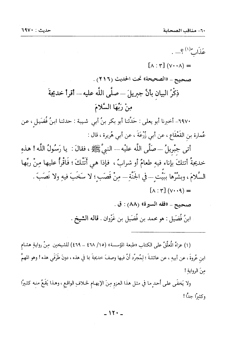 6970 - أَخْبَرَنَا أَبُو يَعْلَى حَدَّثَنَا أَبُو بَكْرِ بْنُ أَبِي شَيْبَةَ حَدَّثَنَا ابْنُ فُضَيْلٍ عَنْ عُمَارَةَ بْنِ الْقَعْقَاعِ عَنْ أَبِي زُرْعَةَ: عَنْ أَبِي هُرَيْرَةَ قَالَ: