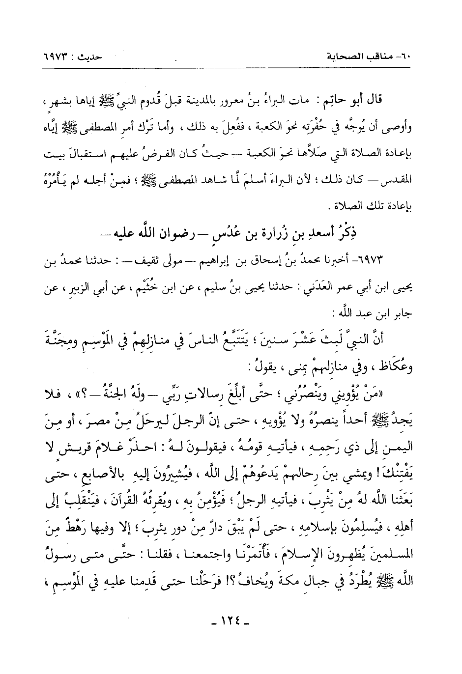 أَنَّ النَّبِيَّ لَبِثَ عَشْرَ سِنِينَ يتتبّعُ النَّاسَ فِي مَنَازِلِهِمْ فِي الموسِمِ ومِجنّة وعُكاظ وَفِي مَنَازِلِهِمْ بِمِنًى يَقُولُ: