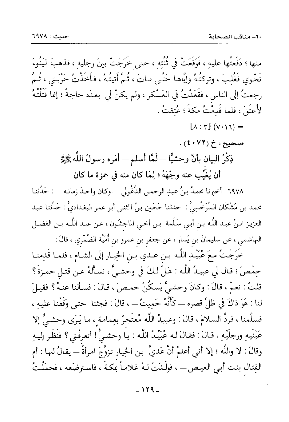 خَرَجْتُ مَعَ عُبَيْدِ اللَّهِ بْنِ عَدِيِّ بْنِ الْخِيَارِ إِلَى الشَّامِ فَلَمَّا قَدِمْنَا حِمْصَ قَالَ لِي عُبَيْدُ اللَّهِ: هَلْ لَكَ فِي وَحْشِيٍّ نَسْأَلُهُ عَنْ قَتْلِ حَمْزَةَ؟ قُلْتُ: نَعَمْ قَالَ: وَكَانَ وَحْشِيٌّ يَسْكُنُ حِمْصَ قَالَ: فَسَأَلْنَا عَنْهُ فَقِيلَ لَنَا: هُوَ ذَاكَ فِي ظِلِّ قَصْرِهِ - كأنهُ حمِيتٌ - قَالَ: فَجِئْنَا حَتَّى وَقَفْنَا عَلَيْهِ فَسَلَّمْنَا فَرَدَّ السَّلَامَ قَالَ: وَعُبَيْدُ اللَّهِ مُعتجرٌ بِعِمَامَةٍ مَا يَرَى وَحْشِيٌّ إِلَّا عَيْنَيْهُ وَرِجْلَيْهِ قَالَ: فَقَالَ لَهُ عُبَيْدُ اللَّهِ: يَا وَحْشِيُّ أَتَعْرِفُنِي؟ فَنَظَرَ إِلَيْهِ وَقَالَ: لَا وَاللَّهِ إِلَّا أَنِّي أَعْلَمُ أَنَّ عَدِيَّ بْنَ الْخِيَارِ تَزَوَّجَ امْرَأَةً يُقَالُ لَهَا: أُمُّ القِتالِ بِنْتُ أَبِي الْعِيصِ فَوَلَدَتْ لَهُ غُلَامًا بِمَكَّةَ فَاسْتَرْضَعَهُ فحملتُ -[130]- ذَلِكَ الْغُلَامَ مَعَ أُمِّهِ فَنَاوَلْتُهَا إِيَّاهُ فَلَكَأَنِّي نَظَرْتُ إِلَى قَدَمَيْكَ! قَالَ: فَكَشَفَ عُبَيْدُ اللَّهِ عَنْ وَجْهِهِ ثُمَّ قَالَ: أَلَا تُخْبِرُنَا بِقَتْلِ حَمْزَةَ؟ قَالَ: نَعَمْ إِنَّ حَمْزَةَ قَتَلَ طُعَيْمَةَ بْنَ عَدِيِّ بْنِ الْخِيَارِ بِبَدْرٍ قَالَ: فَقَالَ لِي مَوْلَايَ جُبَيْرُ بْنُ مُطْعَمٍ: إِنْ قَتَلْتَ حَمْزَةَ بعمي فأنت حرٌّ قال: فلما أَنْ خَرَجَ النَّاسُ عَامَ عَيْنَيْنِ - قَالَ: وَعَيْنَيْنُ جبل تحت أحد بينه وبين وادٍ - قَالَ: فَخَرَجْتُ مَعَ النَّاسِ إِلَى الْقِتَالِ فَلَمَّا اصْطَفُّوا لِلْقِتَالِ خَرَجَ سِبَاعٌ أَبُو نِيَارٍ قَالَ: فَخَرَجَ إِلَيْهِ حَمْزَةُ بْنُ عَبْدِ الْمُطَّلِبِ فَقَالَ: يَا سِبَاعُ يَا ابْنَ أُمِّ أَنْمَارٍ يَا ابْنَ مقطَّعةِ الْبُظُورِ تحادُّ اللَّهَ وَرَسُولَهُ؟ قَالَ: ثُمَّ شَدَّ عَلَيْهِ فَكَانَ كَأَمْسِ الذَّاهِبِ قَالَ: وانكمنتُ لِحَمْزَةَ حَتَّى مَرَّ عَلَيَّ فَلَمَّا أَنْ دَنَا مِنِّي رَمَيْتُهُ بِحَرْبَتِي فَأَضَعُهَا فِي ثُنَّتِهِ حَتَّى خَرَجَتْ مِنْ بَيْنَ وَرِكَيْهِ. قَالَ: فَكَانَ ذَلِكَ الْعَهْدُ بِهِ فَلَمَّا رَجَعَ النَّاسُ رَجَعْتُ مَعَهُمْ فَأَقَمْتُ بِمَكَّةَ حَتَّى نَشَأَ فِيهَا الْإِسْلَامُ ثُمَّ خَرَجْتُ إِلَى الطَّائِفِ قَالَ: وَأَرْسَلُوا إلى رسول الله صلى الله عليه وسلم رُسُلاً قَالَ: وَقِيلَ لَهُ: إِنَّهُ لَا يهِيجُ الرُّسُل قَالَ: فَجِئْتُ فِيهِمْ حَتَّى قَدِمْتُ عَلَى رسول الله صلى الله عليه وسلم فلما رَآنِي رَسُولُ اللَّهِ صَلَّى اللَّهُ عَلَيْهِ وَسَلَّمَ قَالَ: