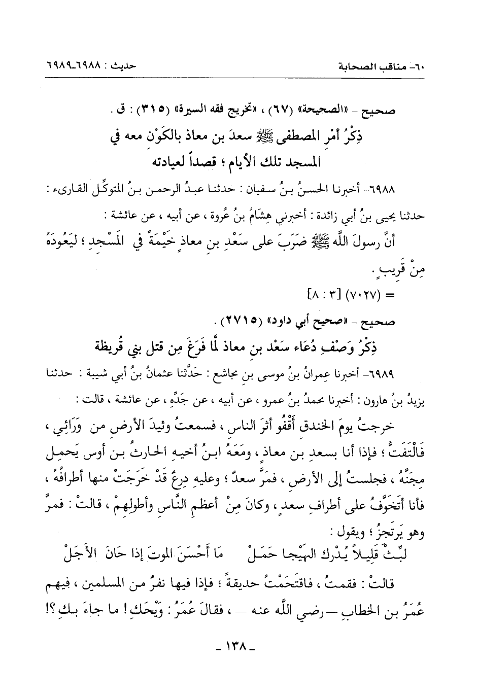 ذِكْرُ أَمْرِ الْمُصْطَفَى صَلَّى اللَّهُ عَلَيْهِ وَسَلَّمَ سَعْدَ بْنَ مُعَاذٍ بِالْكَوْنِ مَعَهُ فِي الْمَسْجِدِ تِلْكَ الْأَيَّامَ قَصْدًا لِعِيَادَتِهِ