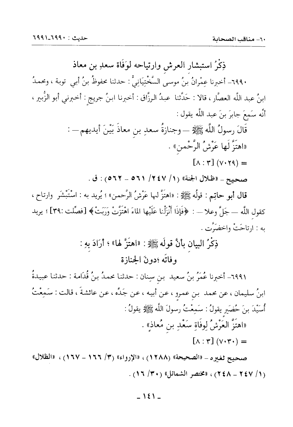قَالَ أَبُو حَاتِمٍ: قَوْلُهُ صَلَّى اللَّهُ عَلَيْهِ وَسَلَّمَ: (اهتزَّ لَهَا عَرْشُ الرَّحْمَنِ) يُرِيدُ بِهِ: استبشَر وَارْتَاحَ كَقَوْلِ اللَّهِ جَلَّ وَعَلَا: {فَإِذَا أنزلنا عليها الماء اهتزت وربت} [فصلت: 39] يُرِيدُ بِهِ: ارْتَاحَتْ واخضرَّت.