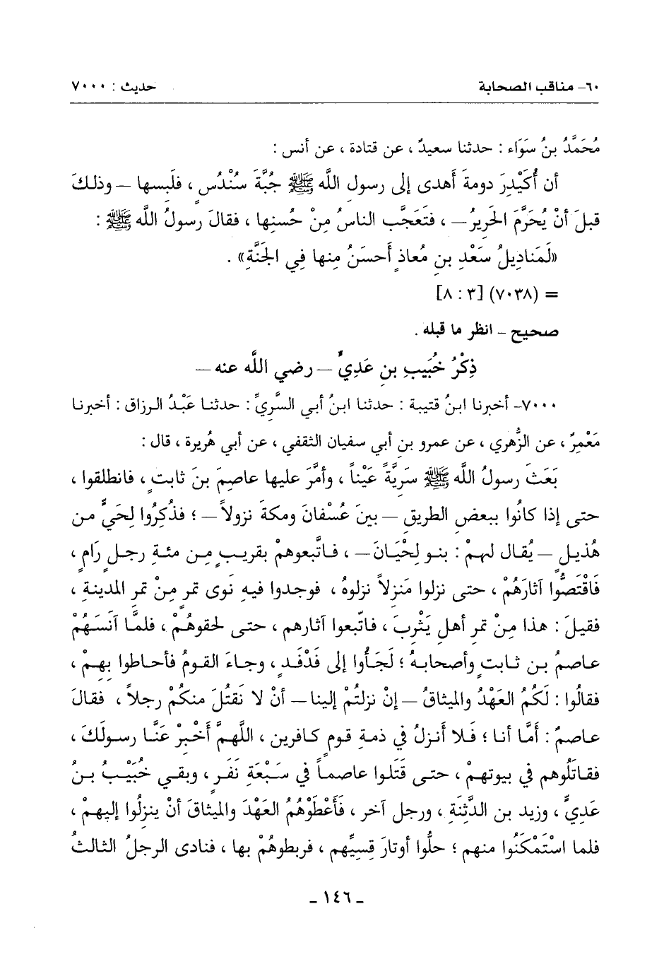 بَعَثَ رَسُولُ اللَّهِ صَلَّى الله عليه وسلم سرِيةً عيناً وأمّر عليها عاصِم بْنَ ثَابِتٍ فَانْطَلَقُوا حَتَّى إِذَا كَانُوا بِبَعْضِ الطَّرِيقِ - بَيْنَ عُسفان وَمَكَّةَ نُزُولًا - فذُكِرُوا لِحيٍّ مِنْ هُذيل يُقال لَهُمْ: بَنُو لِحْيَانَ فاتّبعوهم بقريب من مئة رَجُلٍ رَامٍ فاقتَصُّوا آثَارَهُمْ حَتَّى نَزَلُوا مَنْزِلًا نَزَلُوهُ فَوَجَدُوا فِيهِ نَوَى تَمْرٍ مِنْ تَمْرِ الْمَدِينَةِ فَقِيلَ: هَذَا مِنْ تَمْرِ أَهْلِ يَثْرِبَ فَاتَّبَعُوا آثَارَهُمْ حَتَّى لَحِقُوهُمْ فَلَمَّا آنسَهُم عَاصِمُ بن ثابت وأصحابه لجأوا إِلَى فَدْفَدٍ وَجَاءَ الْقَوْمُ فَأَحَاطُوا بِهِمْ فَقَالُوا: لَكُمُ الْعَهْدُ وَالْمِيثَاقُ إِنْ نَزَلْتُمْ إِلَيْنَا أَنْ لَا نَقْتُلَ مِنْكُمْ رَجُلًا فَقَالَ عَاصِمٌ: أَمَّا أَنَا فَلَا أنزلُ فِي ذِمَّةِ قَوْمٍ كَافِرِينَ اللَّهُمَّ أَخْبِرْ عَنَّا رَسُولَكَ فقاتَلُوهم فِي بُيُوتِهِمْ حَتَّى قَتَلُوا عَاصِمًا فِي سبعةِ نفرٍ وَبَقِيَ خُبيب بْنُ عَدِيٍّ وَزَيْدُ بْنُ الدَّثنة وَرَجُلٌ آخَرُ فَأَعْطَوْهُمُ الْعَهْدَ وَالْمِيثَاقَ أَنْ يَنْزِلُوا إِلَيْهِمْ فَلَمَّا اسْتَمْكَنُوا مِنْهُمْ حلُّوا أَوْتَارَ قِسِيِّهم فَرَبَطُوهُمْ بِهَا فَنَادَى الرَّجُلُ الثَّالِثُ -[147]- الَّذِي مَعَهُمَا هَذَا أَوَّلُ الْغَدْرِ فَأَبَى أَنْ يَصْحَبَهُمْ فجرَّوه فَأَبَى أَنْ يَتَّبِعَهُمْ وَقَالَ: لِي فِي هَؤُلَاءِ أُسْوَةٌ فَضَرَبُوا عُنُقَهُ. وَانْطَلَقُوا بِخُبَيْبِ بْنِ عَدِيٍّ وَزَيْدِ بْنِ الدَّثنة حَتَّى بَاعُوهُمَا بِمَكَّةَ فَاشْتَرَى خُبيباً بَنُو الْحَارِثِ بْنُ عَامِرٍ وَكَانَ الْحَارِثُ قتِلَ يَوْمَ بَدْرٍ فَمَكَثَ عِنْدَهُمْ أَسِيرًا حَتَّى إِذَا اجْتَمَعُوا عَلَى قَتْلِهِ اسْتَعَارَ مُوسى مِنْ إِحْدَى بَنَاتِ الْحَارِثِ يَستَحِدُّ بِهِ فَأَعَارَتْهُ قَالَتْ: فغفلتُ عَنْ صَبِيٍّ لِي حَتَّى أتاهُ فأخذهُ فأضْجعَهُ عَلَى فَخِذِهِ وَالْمُوسَى فِي يَدِهِ فَلَمَّا رَأَيْتُهُ فِزعتُ فَزَعًا شَدِيدًا فَقَالَ: خشِيتِ أَنْ أقتُلهُ؟ مَا كُنْتُ لِأَفْعَلَ إِنْ شَاءَ اللَّهُ قَالَ: فَكَانَتْ تَقُولُ: مَا رَأَيْتُ أَسِيرًا قَطُّ خَيْرًا مِنْ خُبَيْبٍ لَقَدْ رَأَيْتُهُ يَأْكُلُ مِنْ قِطْفِ عنبٍ وَمَا بِمَكَّةَ يَوْمَئِذٍ ثَمَرَةٌ وَإِنَّهُ لَمُوثَقٌ فِي الْحَدِيدِ وَمَا كَانَ إِلَّا رِزْقًا رزقهُ اللَّهُ إِيَّاهُ ثُمَّ خَرَجُوا بِهِ مِنَ الْحَرَمِ ليَقْتُلُوهُ فقَالَ: دَعُونِي أُصَلِّي رَكْعَتَيْنِ فَصَلَّى رَكْعَتَيْنِ ثم قال: لولا أن تروا أن مابي جَزَعٌ مِنَ الْمَوْتِ لزدْتُ فَكَانَ أَوَّلَ مَنْ سنَّ الركعتين عند القتل ثم قال: