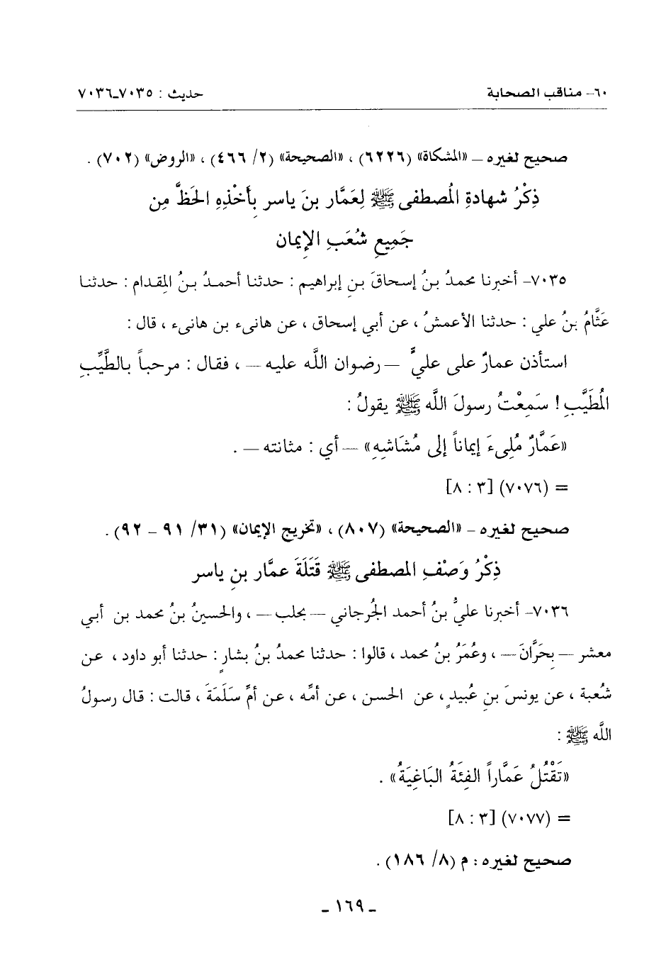 ذِكرُ شهادةِ المُصطفى صَلَّى اللَّهُ عَلَيْهِ وَسَلَّمَ لِعمّار بْنِ يَاسِرٍ بِأخذِهِ الْحَظَّ مِنْ جمِيعِ شُعبِ الِإيمان.