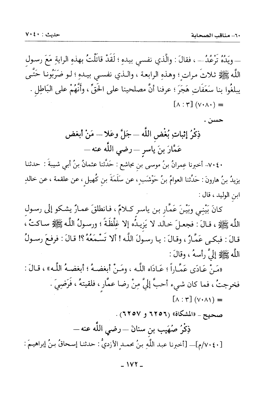 (مَنْ عَادَى عَمَّارًا عَادَاهُ اللَّهُ وَمَنْ أبغضهُ أبغضهُ اللَّهُ) قَالَ: فَخَرَجْتُ فَمَا كَانَ شَيْءٌ أَحَبَّ إِلَيَّ مِنْ رِضَا عَمَّارٍ فلقيتهُ فَرَضِيَ.