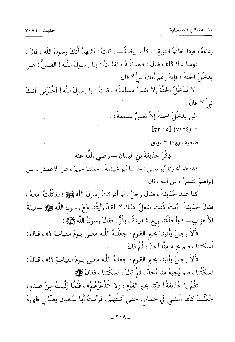 (قُمْ يَا حذيفةُ! فَأْتِنَا بِخَبَرِ الْقَوْمِ وَلَا تَذعَرهُم) فَلَمَّا وَلَّيتُ مِنْ عِنْدِهِ جَعَلْتُ كَأَنَّمَا أَمْشِي فِي حَمَّامٍ حَتَّى أَتَيْتُهُمْ فَرَأَيْتُ أَبَا سُفْيَانَ يَصْلي ظهرهُ -[209]- بِالنَّارِ فَوَضَعْتُ سَهْمًا فِي كَبِدِ الْقَوْسِ فأردتُ أَنْ أَرْمِيَهُ فَذَكَرْتُ قَوْلِ رَسُولُ اللَّهِ صَلَّى اللَّهُ عَلَيْهِ وَسَلَّمَ: