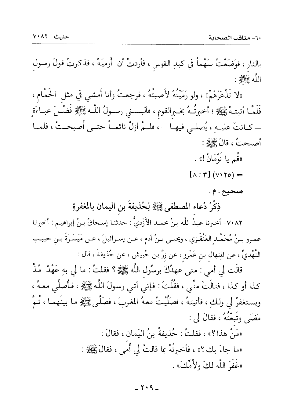 7082 - أَخْبَرَنَا عبدُ اللَّهِ بْنُ مُحَمَّدٍ الْأَزْدِيُّ حَدَّثَنَا إِسْحَاقُ بْنُ إِبْرَاهِيمَ أَخْبَرَنَا عَمْرُو بْنُ مُحَمَّدٍ الْعَنْقَزِيُّ وَيَحْيَى بْنُ آدَمَ عَنْ إِسْرَائِيلَ عَنْ مَيْسَرَةَ بْنِ حَبِيبٍ النهديِّ عَنِ المِنهال بْنِ عَمْرٍو عَنْ زِرِّ بْنِ حُبيش عَنْ حُذَيْفَةَ قَالَ: