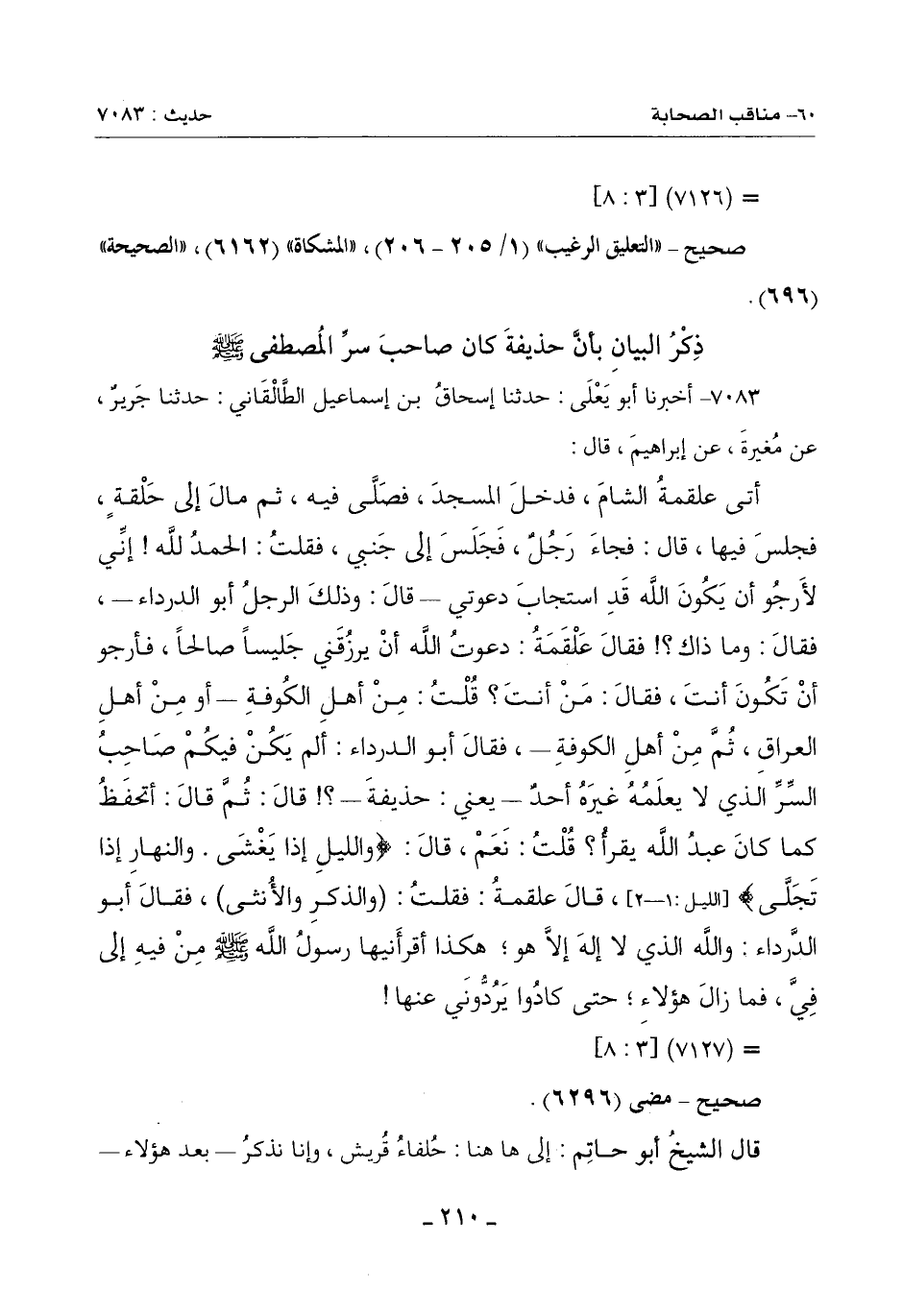 ذِكْرُ الْبَيَانِ بِأَنَّ حُذَيْفَةَ كَانَ صَاحِبَ سِرِّ الْمُصْطَفَى صَلَّى اللَّهُ عَلَيْهِ وَسَلَّمَ