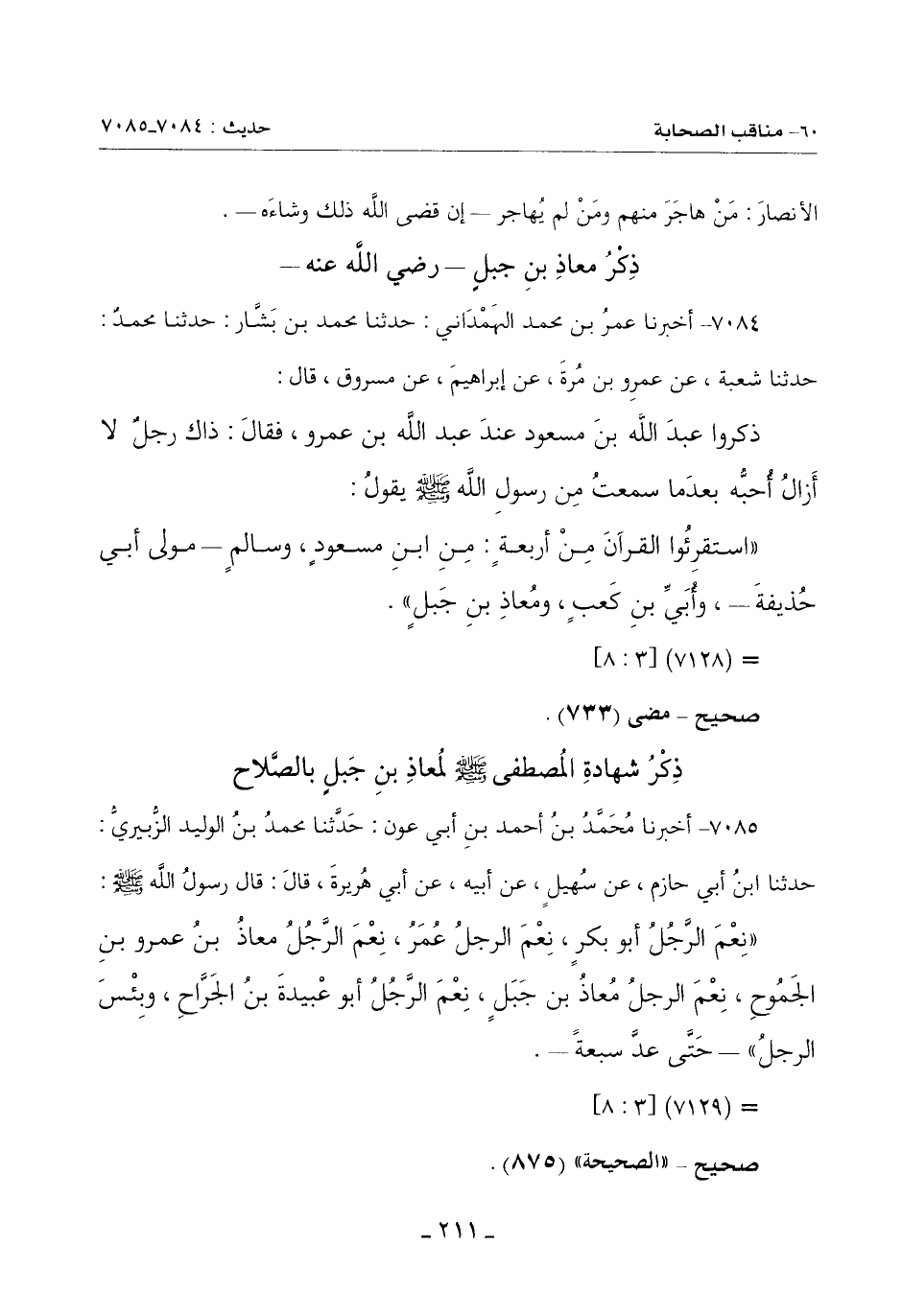 (نِعْمَ الرَّجُلُ أَبُو بَكْرٍ نِعم الرَّجُلُ عُمَرُ نِعم الرَّجُلُ مُعَاذُ بْنُ عَمْرِو بْنِ الْجَمُوحِ نِعم الرَّجُلُ مُعَاذُ بْنُ جَبَلٍ نِعم الرَّجُلُ أَبُو عُبَيْدَةَ بْنُ الْجَرَّاحِ وبِئس الرجلُ) ـ حتى عدَّ سبعة ـ.