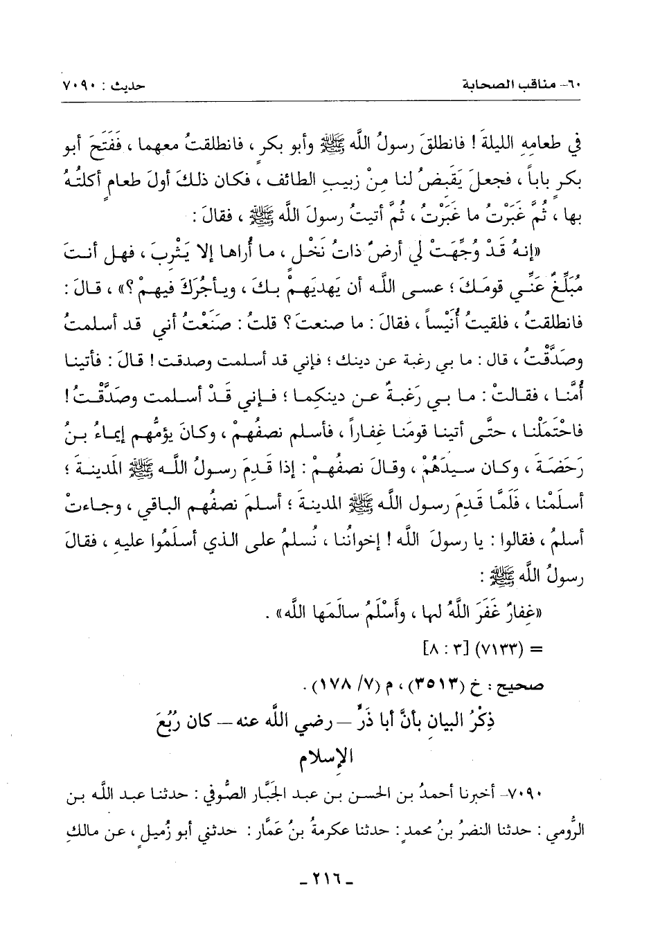 قال الشيخ: قول أبي ذر: كنت ربع الْإِسْلَامِ أَرَادَ مِنْ قَوْمِهِ لِأَنَّ فِي ذَلِكَ الوقت أسلم الخلقُ من قُريش وغيرهم.