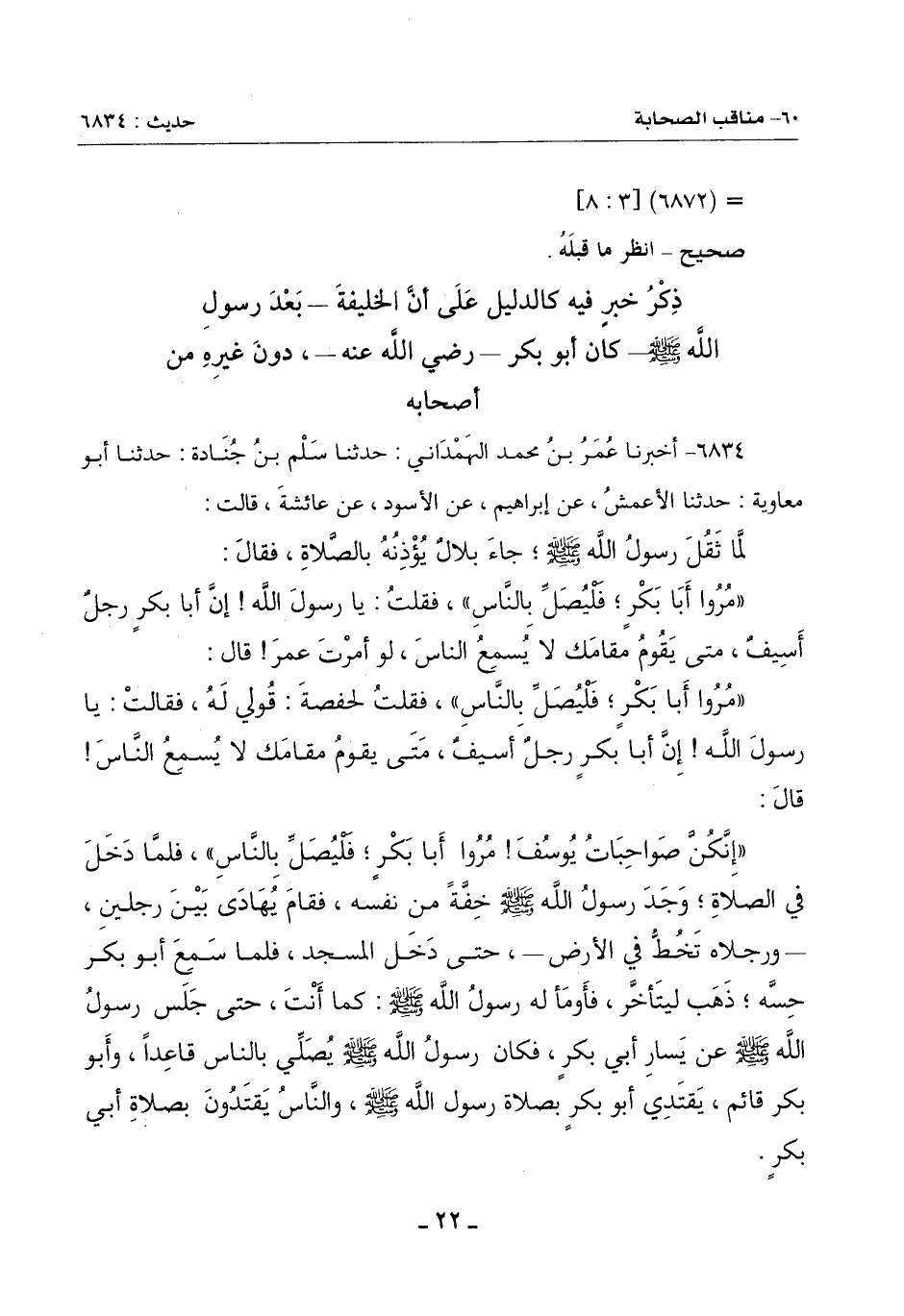 (إنكنَّ صَوَاحِبَاتُ يُوسُفَ مُرُوا أَبَا بَكْرٍ فليُصلِّ بِالنَّاسِ) فَلَمَّا دَخَلَ فِي الصَّلَاةِ وَجَدَ رَسُولُ اللَّهِ صَلَّى اللَّهُ عَلَيْهِ وَسَلَّمَ خِفَّةً مِنْ نَفْسِهِ فَقَامَ يُهَادَى بَيْنَ رَجُلَيْنِ وَرِجْلَاهُ تَخُطُّ فِي الْأَرْضِ حَتَّى دَخَلَ الْمَسْجِدَ فَلَمَّا سَمِعَ أَبُو بَكْرٍ حِسَّهُ ذَهَبَ لِيَتَأَخَّرَ فَأَوْمَأَ لَهُ رَسُولُ اللَّهِ صَلَّى اللَّهُ عَلَيْهِ وَسَلَّمَ: كَمَا أَنْتَ حَتَّى جَلَسَ رَسُولُ اللَّهِ صَلَّى اللَّهُ عَلَيْهِ وَسَلَّمَ عَنْ يَسَارِ أَبِي بَكْرٍ فَكَانَ رَسُولُ اللَّهِ صَلَّى اللَّهُ عَلَيْهِ وَسَلَّمَ يُصَلِّي بِالنَّاسِ قَاعِدًا وَأَبُو بَكْرٍ قَائِمٌ يَقْتَدِي أَبُو بَكْرٍ بِصَلَاةِ رَسُولِ اللَّهِ صَلَّى اللَّهُ عَلَيْهِ وَسَلَّمَ وَالنَّاسُ يقتدون بصلاة أبي بكر -[23]-