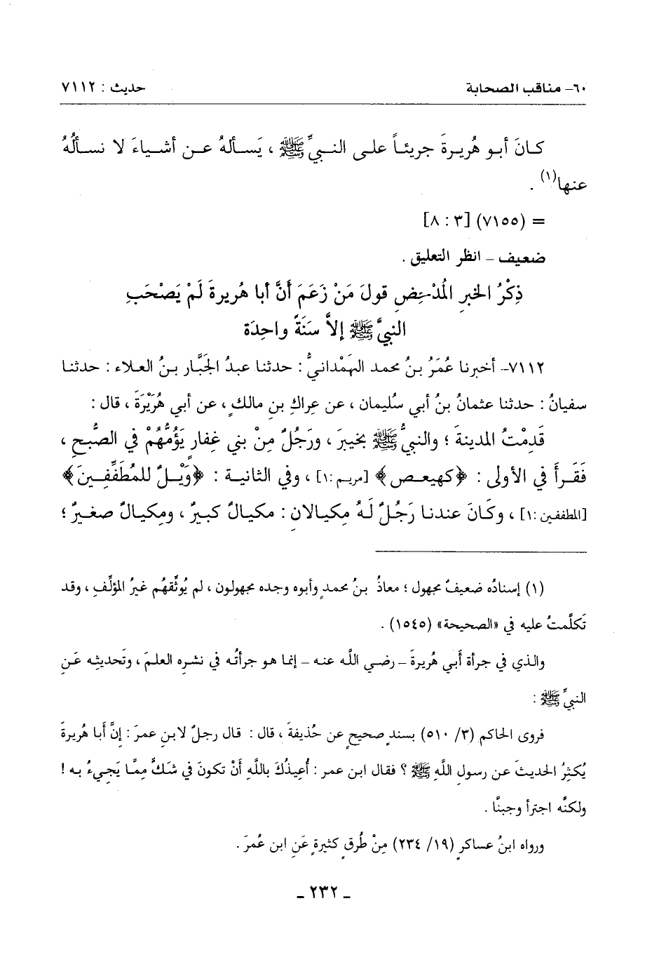 7112 - أَخْبَرَنَا عُمَرُ بْنُ مُحَمَّدٍ الْهَمْدَانِيُّ حَدَّثَنَا عَبْدُ الْجَبَّارِ بْنُ الْعَلَاءِ حَدَّثَنَا سُفْيَانُ حَدَّثَنَا عُثْمَانُ بْنُ أَبِي سُلَيْمَانَ عَنْ عِراك بْنِ مَالِكٍ عَنْ أَبِي هُرَيْرَةَ قَالَ: