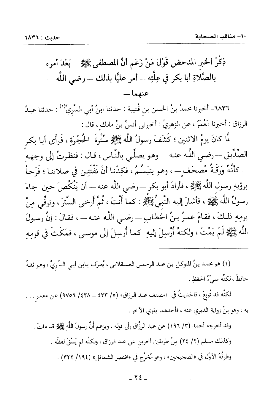 لَمَّا كَانَ يَوْمُ الِاثْنَيْنِ كَشَفَ رَسُولُ اللَّهِ صَلَّى اللَّهُ عَلَيْهِ وَسَلَّمَ سُتْرَةَ الْحُجْرَةِ فَرَأَى أَبَا بَكْرٍ الصِّدِّيقَ رَضِيَ اللَّهُ عَنْهُ وَهُوَ يُصَلِّي بِالنَّاسِ قَالَ: فَنَظَرْتُ إِلَى وَجْهِهِ كأنه ورقة مصحف وهو يبتسم فكِدنا أَنْ نَفْتَتِنَ فِي صَلَاتِنَا فَرَحًا بِرُؤْيَةِ رَسُولِ اللَّهِ صَلَّى اللَّهُ عَلَيْهِ وَسَلَّمَ فَأَرَادَ أَبُو بَكْرٍ رَضِيَ اللَّهُ عَنْهُ أَنْ يَنْكُصَ حِينَ جَاءَ رَسُولُ اللَّهِ صَلَّى اللَّهُ عَلَيْهِ وَسَلَّمَ فَأَشَارَ إِلَيْهِ النَّبِيُّ صَلَّى اللَّهُ عَلَيْهِ وَسَلَّمَ: كَمَا أَنْتَ ثُمَّ أَرْخَى السِّتْرَ وَتُوُفِّيَ مِنْ يَوْمِهِ ذَلِكَ فَقَامَ عُمَرُ بْنُ الْخَطَّابِ رَضِيَ اللَّهُ عَنْهُ فَقَالَ: إِنَّ رَسُولَ اللَّهِ صَلَّى اللَّهُ عَلَيْهِ وَسَلَّمَ لَمْ يَمُتْ وَلَكِنَّهُ أُرسل إِلَيْهِ كَمَا أُرسل إِلَى مُوسَى فَمَكَثَ فِي قَوْمِهِ -[25]- أَرْبَعِينَ لَيْلَةً وَاللَّهِ إِنِّي لَأَرْجُو أَنْ يَعِيشَ رَسُولُ اللَّهِ صَلَّى اللَّهُ عَلَيْهِ وَسَلَّمَ حَتَّى يَقْطَعَ أَيْدِيَ رِجَالٍ مِنَ الْمُنَافِقِينَ وَأَلْسِنَتَهُمْ يَزْعُمُونَ أَنَّ رَسُولَ اللَّهِ صَلَّى اللَّهُ عَلَيْهِ وَسَلَّمَ قَدْ مَاتَ!