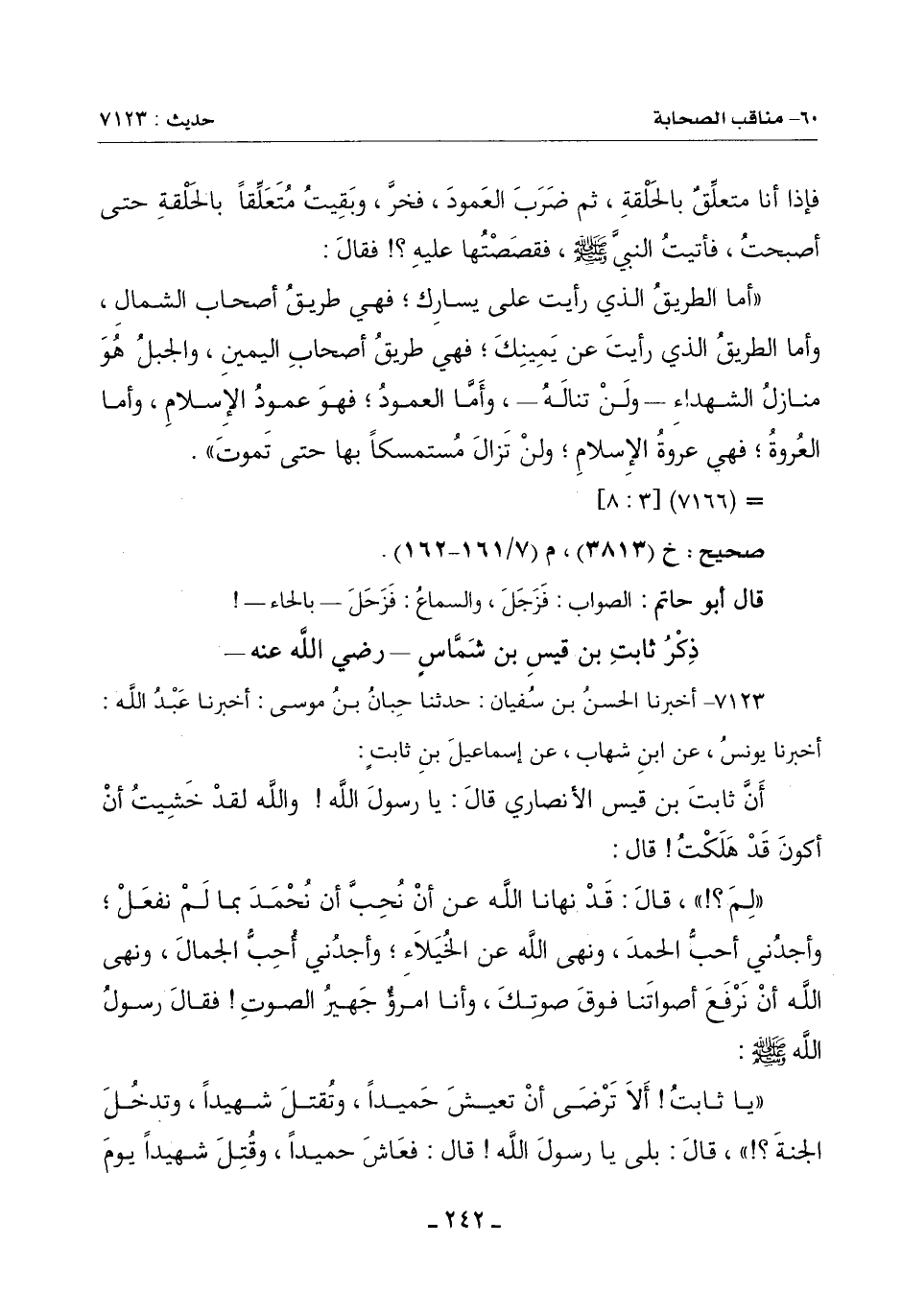 (يَا ثَابِتُ أَلَا تَرْضَى أَنْ تَعِيشَ حَمِيدًا وتُقتل شَهِيدًا وَتَدْخُلَ الْجَنَّةِ؟ ) قَالَ: بَلَى يَا رَسُولَ اللَّهِ قَالَ: فَعَاشَ حَمِيدًا وقُتِلَ شهيداً يوم -[243]- مسيلمة الكذاب