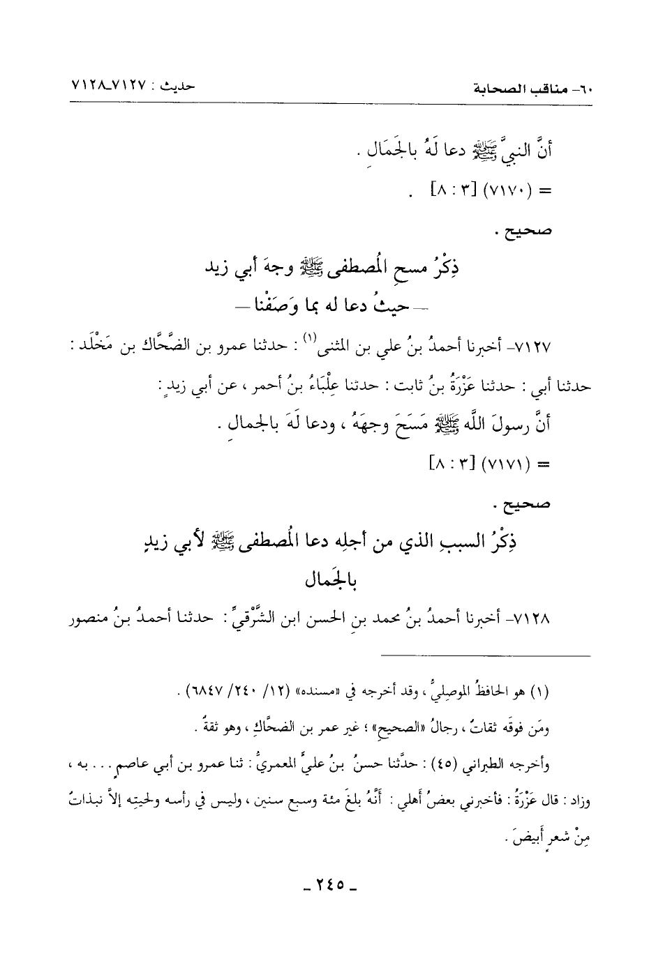 ذِكْرُ السَّبَبِ الَّذِي مِنْ أَجَلِهِ دَعَا الْمُصْطَفَى صَلَّى اللَّهُ عَلَيْهِ وَسَلَّمَ لِأَبِي زَيْدٍ بِالْجَمَالِ