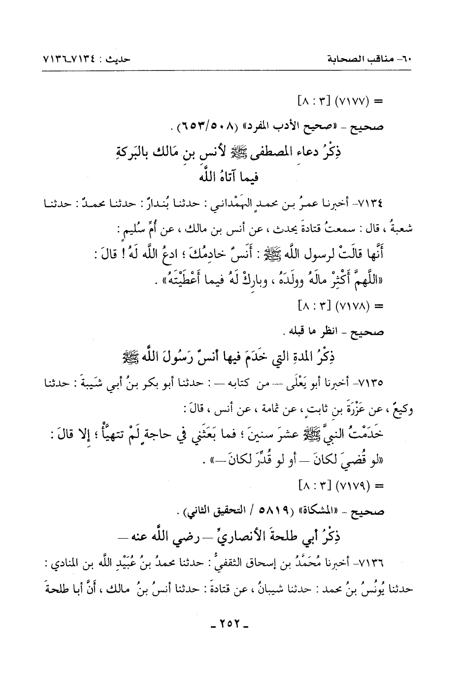7136 - أَخْبَرَنَا مُحَمَّدُ بْنُ إِسْحَاقَ الثَّقَفِيُّ حَدَّثَنَا مُحَمَّدُ بن عبيد الله ابن الْمُنَادِي حَدَّثَنَا يُونُسُ بْنُ مُحَمَّدٍ حَدَّثَنَا شَيْبَانُ عَنْ قَتَادَةَ حَدَّثَنَا أَنَسُ بْنُ مَالِكٍ أَنَّ أَبَا طَلْحَةَ -[253]- قَالَ: