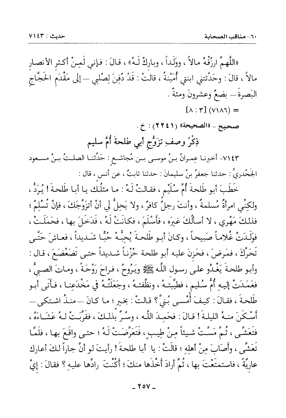 خَطَبَ أَبُو طَلْحَةَ أُمَّ سُلَيْمٍ فَقَالَتْ لَهُ: مَا مِثْلُكَ يَا أَبَا طَلْحَةَ يُرَدُّ وَلَكِنِّي امْرَأَةٌ مَسْلِمَةٌ وَأَنْتَ رَجُلٌ كَافِرٌ وَلَا يَحِلُّ لِي أَنْ أَتَزَوَّجَكَ فَإِنْ تُسْلِمْ فَذَلِكَ مَهْرِي لَا أَسْأَلُكَ غَيْرَهُ فَأَسْلَمَ فَكَانَتْ لَهُ فَدَخَلَ بِهَا فَحَمَلَتْ فَوَلَدَتْ غُلَامًا صَبِيحًا وَكَانَ أَبُو طَلْحَةَ يُحِبُّهُ حُبًّا شَدِيدًا فَعَاشَ حَتَّى تحرَّك فَمَرِضَ فَحَزِنَ عَلَيْهِ أَبُو طَلْحَةَ حُزْنًا شَدِيدًا حَتَّى تَضَعْضَعَ قَالَ: وَأَبُو طَلْحَةَ يَغْدُو عَلَى رَسُولِ اللَّهِ صَلَّى اللَّهُ عَلَيْهِ وَسَلَّمَ وَيَرُوحُ فَرَاحَ رَوْحَةً وَمَاتَ الصَّبِيُّ فعَمَدَتْ إِلَيْهِ أُمُّ سُلَيْمٍ فطيَّبته ونظَّفته وَجَعَلَتْهُ فِي مِخْدَعِنَا فَأَتَى أَبُو طَلْحَةَ فَقَالَ: كَيْفَ أَمْسَى بُنَيَّ؟ قَالَتْ: بِخَيْرٍ مَا كَانَ ـ مُنْذُ اشْتَكَى ـ أَسْكَنَ مِنْهُ اللَّيْلَةَ قَالَ: فَحَمِدَ اللَّهَ وسُرَّ بِذَلِكَ فقرَّبت لَهُ عَشَاءَهُ فتعشَّى ثُمَّ مَسَّت شَيْئًا مِنْ طِيبٍ فتعرَّضت لَهُ حَتَّى وَاقَعَ بِهَا فَلَمَّا تَعَشَّى وَأَصَابَ مِنْ أَهْلِهِ قَالَتْ: يَا أَبَا طَلْحَةَ رأيتَ لَوَ أَنَّ جَارًا لَكَ أَعَارَكَ عَارِيَّةً فَاسْتَمْتَعْتَ بِهَا ثُمَّ أَرَادَ أَخْذَهَا مِنْكَ أَكُنْتَ رادَّها عَلَيْهِ؟ فَقَالَ: إِي -[258]- وَاللَّهِ إِنِّي كُنْتُ لرادَّها عَلَيْهِ قَالَتْ: طَيِّبَةً بِهَا نَفْسُكَ؟ قَالَ: طَيْبَةً بِهَا نَفْسِي قَالَتْ: فَإِنَّ اللَّهَ قَدْ أَعَارَكَ بُنَيَّ ومَتَّعَكَ بِهِ مَا شَاءَ ثُمَّ قُبِضَ إِلَيْهِ فَاصْبِرْ وَاحْتَسَبَ قَالَ: فَاسْتَرْجَعَ أَبُو طَلْحَةَ وَصَبَرَ ثُمَّ أَصْبَحَ غَادِيًا عَلَى رَسُولِ اللَّهِ صَلَّى اللَّهُ عَلَيْهِ وَسَلَّمَ فحدَّثه حَدِيثَ أُمِّ سُلَيْمٍ كَيْفَ صَنَعَتْ فَقَالَ رَسُولُ اللَّهِ صَلَّى اللَّهُ عَلَيْهِ وَسَلَّمَ:
